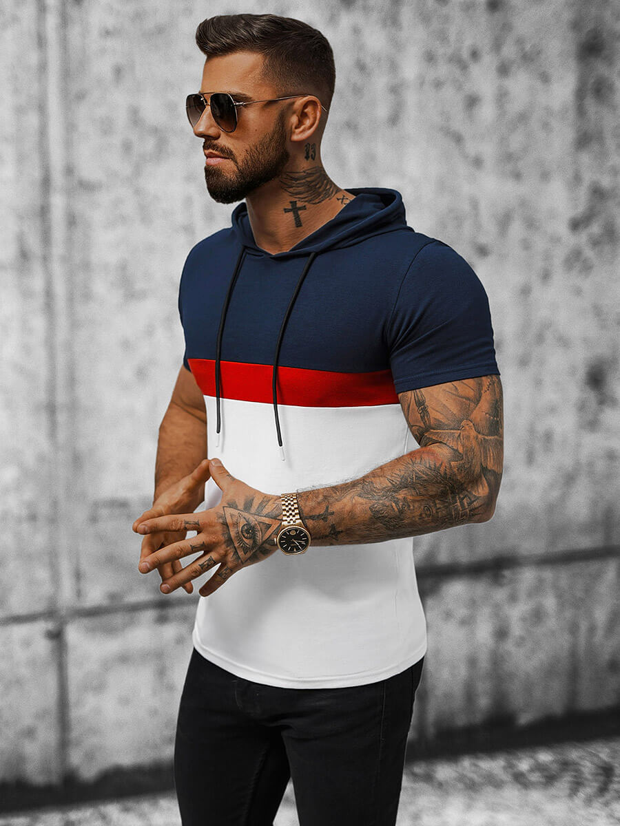 Koszulka pochodzi z naszej najnowszej kolekcji. Ma fason typu slim fit, czyli dopasowujący się do sylwetki. T-shirt posiada praktyczny kaptur skutecznie chroniący przed wiatrem i chłodem. Oryginalnego wyglądu dodają mu kontrastowe łączenia materiału. Koszulka została wyprodukowana z połączenia bawełny oraz poliestru, dzięki czemu jest wygodna w noszeniu, przyjemna w dotyku i ładnie dopasowuje się do sylwetki.