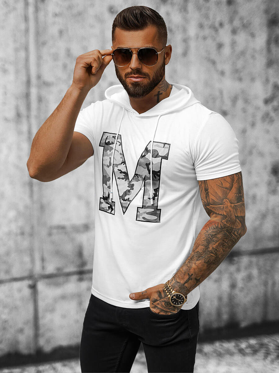 Koszulka pochodzi z naszej najnowszej kolekcji. Ma praktyczny kaptur, który skutecznie chroni przed chłodem czy wiatrem. Z przodu t-shirtu znajduje się duży nadruk w kształcie litery M wypełnionej wzorem moro. Koszulka została wyprodukowana z połączenia bawełny oraz poliestru, co sprawia, że ładnie dopasowuje się do sylwetki, jest wygodna w noszeniu, miękka, przyjemna w dotyku i nie gniecie się.