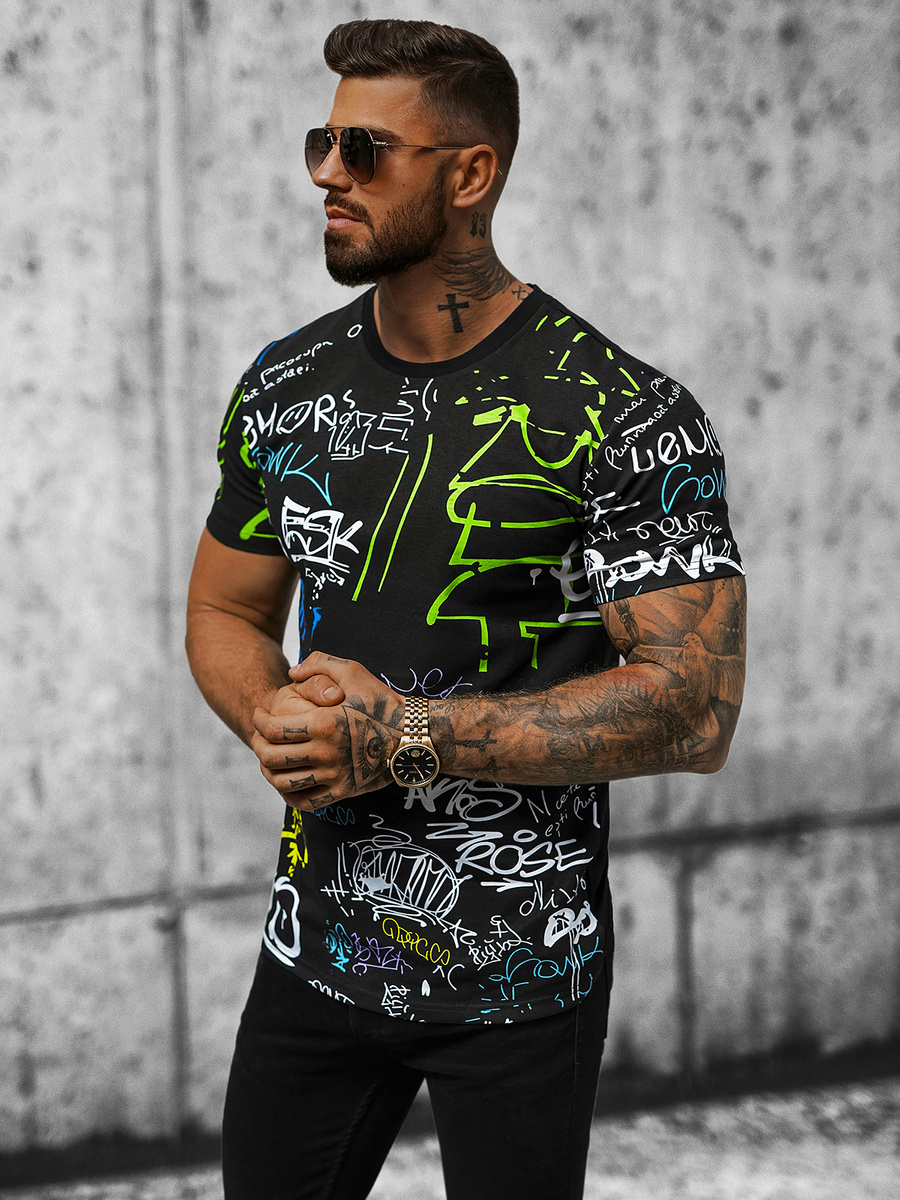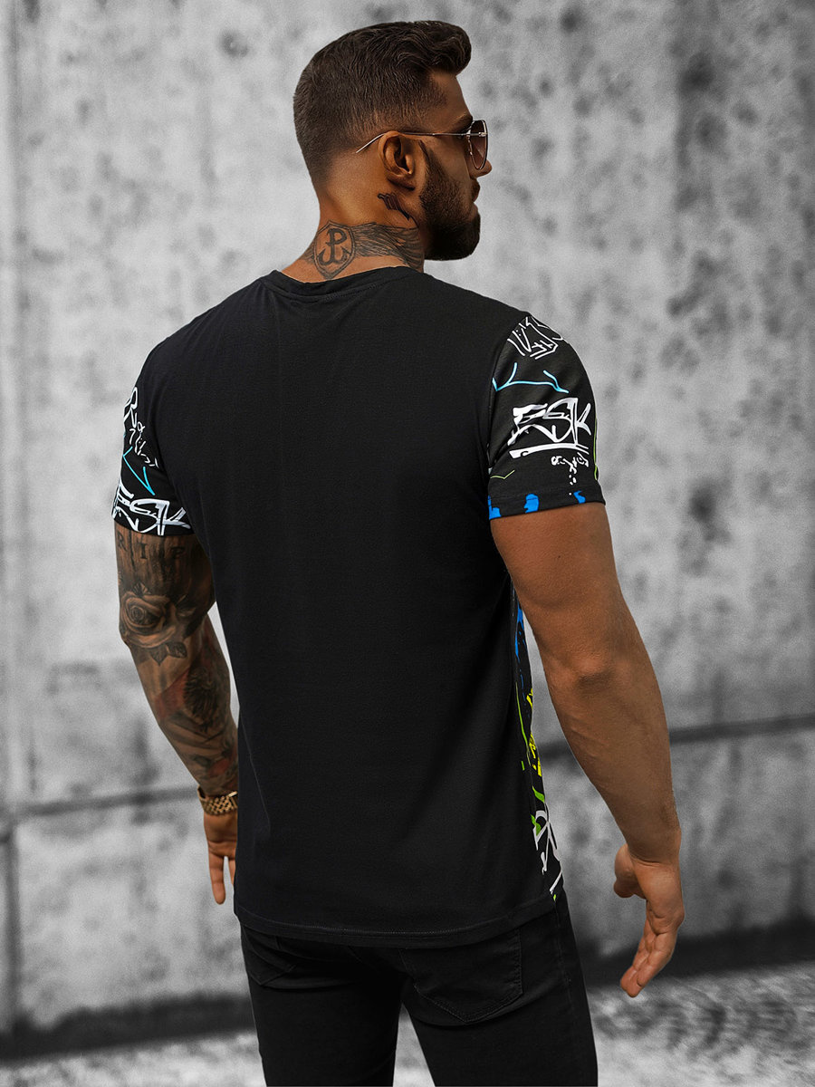 Koszulka pochodzi z naszej najnowszej kolekcji. Z przodu i z tyłu zdobi ją ciekawy, przykuwający wzrok, wielokolorowy nadruk. T-shirt ma fason typu slim fit, czyli dopasowany do sylwetki. Został on wyprodukowany z połączenia bawełny oraz poliestru. Dzięki temu ładnie układa się na ciele, jest przyjemny w dotyku, wygodny w noszeniu i odporny na uszkodzenia, zaplamienia oraz zagniecenia.