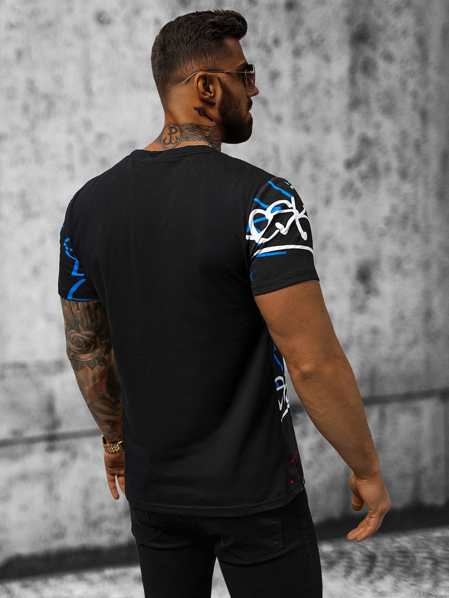 Koszulka pochodzi z naszej najnowszej kolekcji. Z przodu i z tyłu zdobi ją ciekawy, przykuwający wzrok, wielokolorowy nadruk. T-shirt ma fason typu slim fit, czyli dopasowany do sylwetki. Został on wyprodukowany z połączenia bawełny oraz poliestru. Dzięki temu ładnie układa się na ciele, jest przyjemny w dotyku, wygodny w noszeniu i odporny na uszkodzenia, zaplamienia oraz zagniecenia.