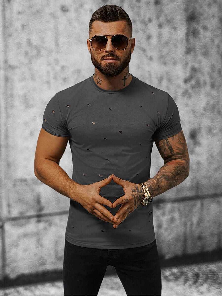 Koszulka pochodzi z naszej najnowszej kolekcji. Występuje w ponadczasowym, szarym kolorze. T-shirt ma klasyczny, okrągły dekolt typu U-neck. Oryginalnego wyglądu nadają mu znajdujące się na całej powierzchni dziury oraz ozdobna, metalowa czaszka. Koszulka została wyprodukowana z bawełny z domieszką elastanu, dzięki czemu jest przyjemna w dotyku, wygodna w noszeniu i ładnie dopasowuje się do sylwetki.