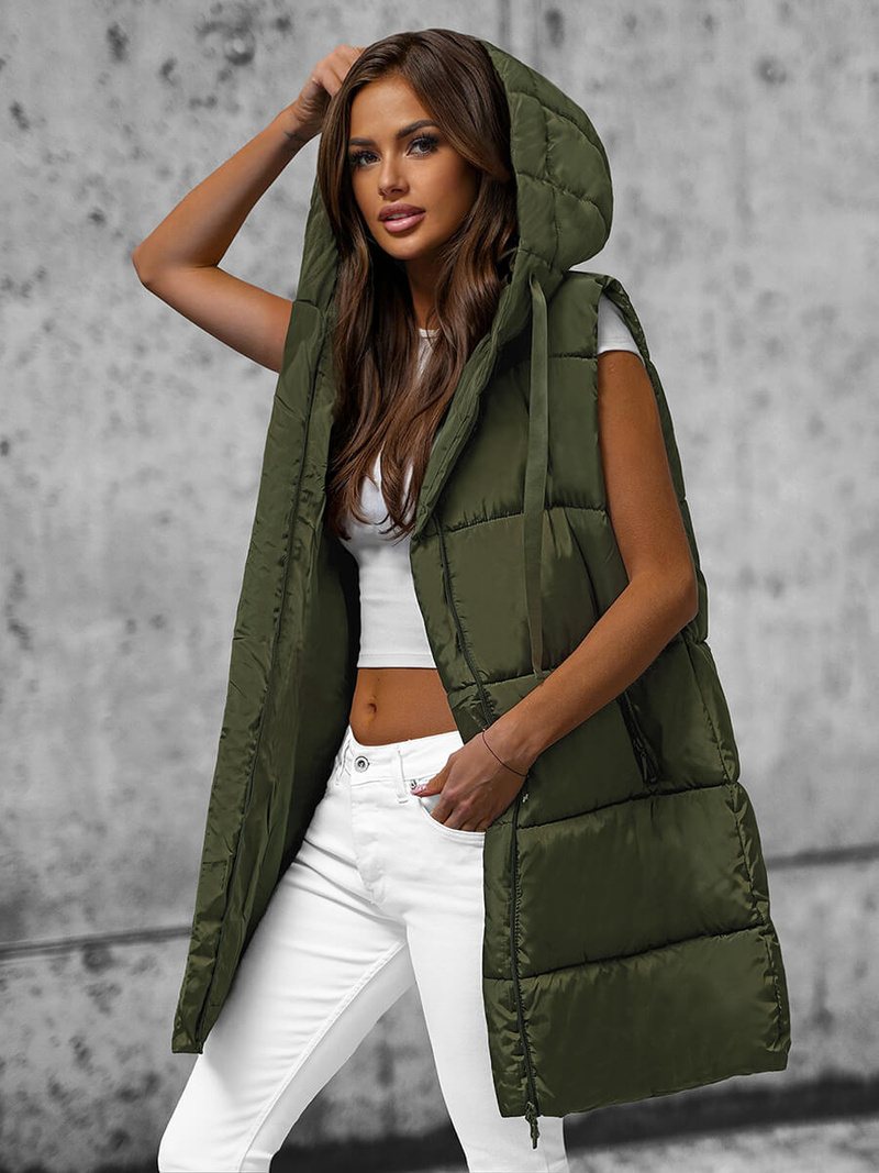 Kamizelka pochodzi z nowej kolekcji. Sięga za biodra i jest zapinana na zamek błyskawiczny. Posiada kaptur, który bardzo dobrze sprawdza się w chłodne, wietrzne, deszczowe dni. Po bokach kamizelki znajdują się praktyczne kieszenie, do których można schować niezbędne drobiazgi, takie jak klucze, telefon czy portfel. Pokrywające ją pikowania nadają jej oryginalnego wyglądu. Kamizelka została wykonana w całości z poliestru, co sprawia, że ładnie układa się na ciele, szybko schnie i nie gniecie się.