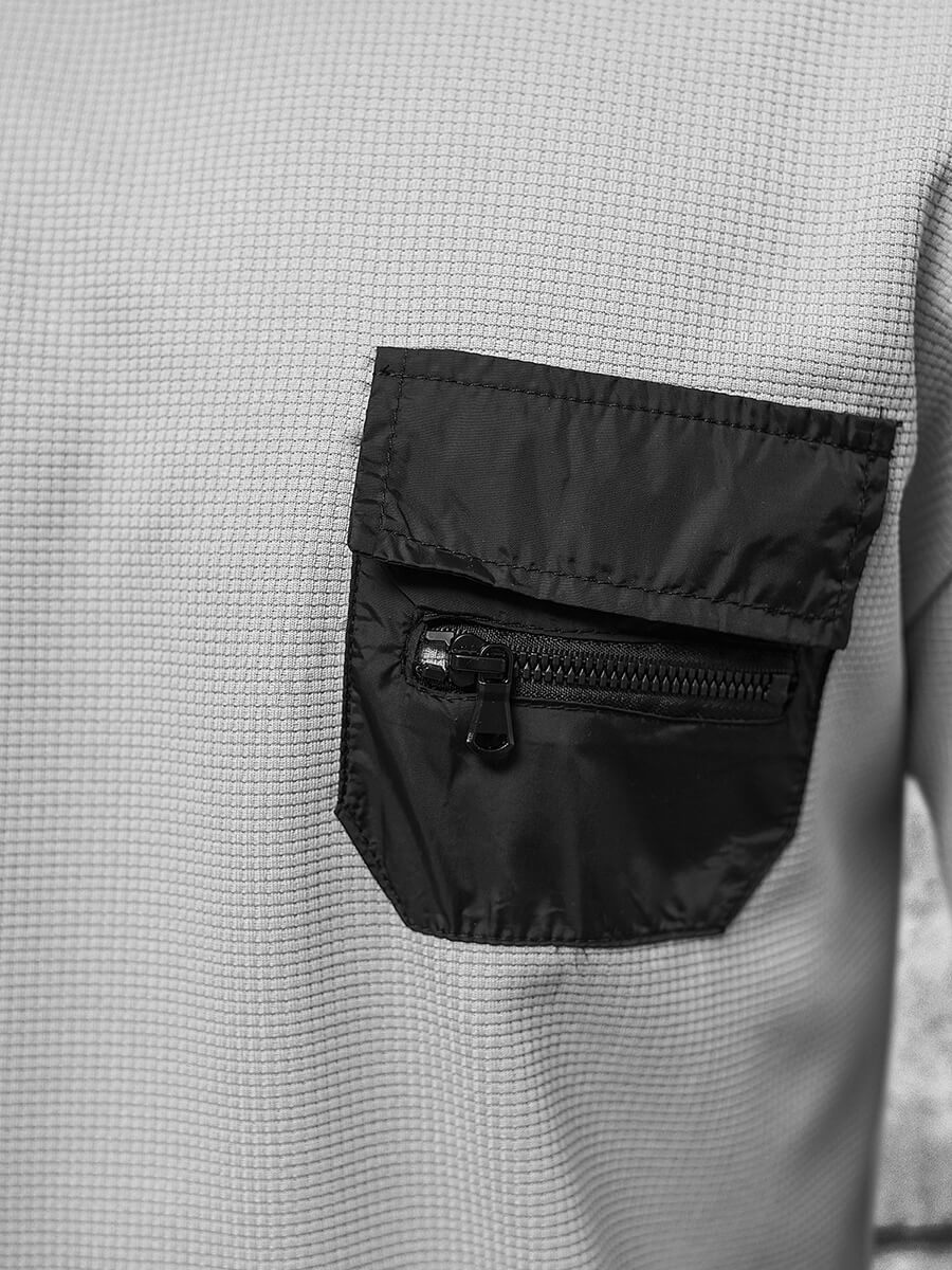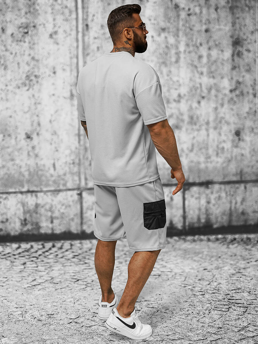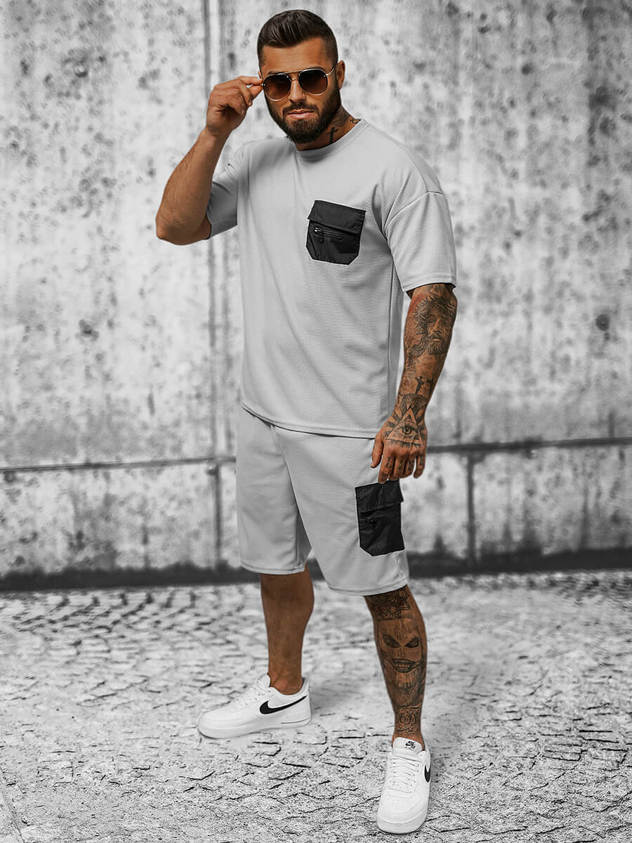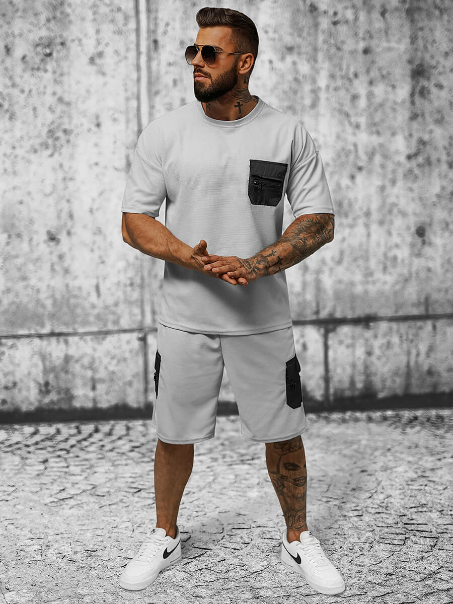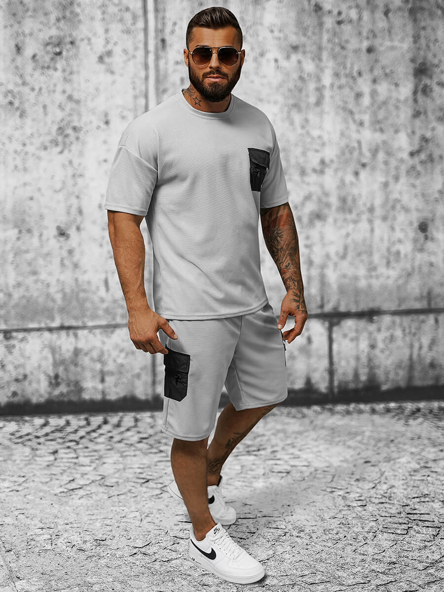 Zestaw pochodzi z najnowszej kolekcji. Składa się z dwóch elementów. Jednym z nich jest koszulka z krótkim rękawem oraz kieszonką nadającą oryginalnego wyglądu. Drugi to spodenki z kieszeniami z przodu i po bokach, do których można schować drobiazgi, takie jak klucze, portfel czy telefon. Komplet został wyprodukowany z bawełny z domieszką elastanu, dzięki czemu jest wygodny w noszeniu, ładnie dopasowuje się do sylwetki i jest odporny na uszkodzenia oraz zagniecenia.
