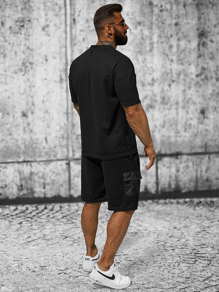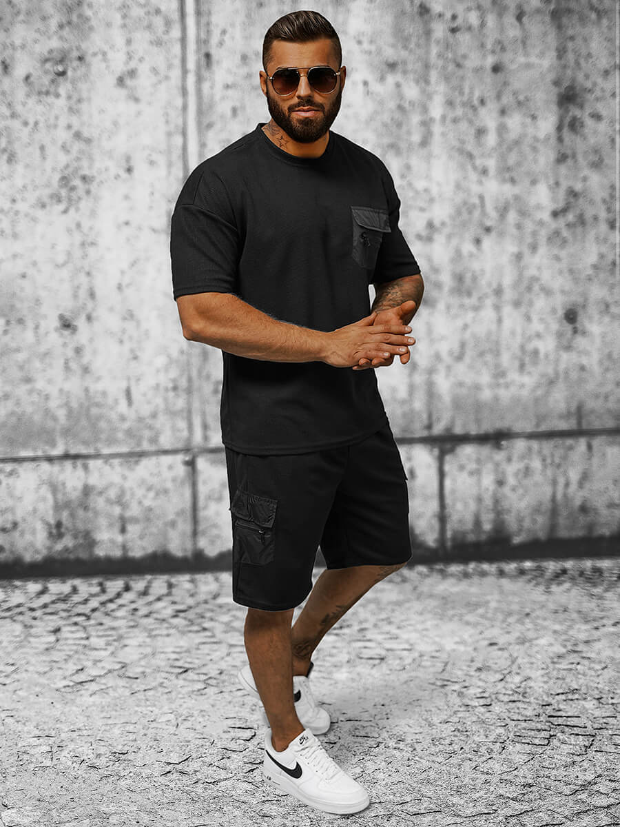 Zestaw pochodzi z najnowszej kolekcji. Składa się z dwóch elementów. Jednym z nich jest koszulka z krótkim rękawem oraz kieszonką nadającą oryginalnego wyglądu. Drugi to spodenki z kieszeniami z przodu i po bokach, do których można schować drobiazgi, takie jak klucze, portfel czy telefon. Komplet został wyprodukowany z bawełny z domieszką elastanu, dzięki czemu jest wygodny w noszeniu, ładnie dopasowuje się do sylwetki i jest odporny na uszkodzenia oraz zagniecenia.