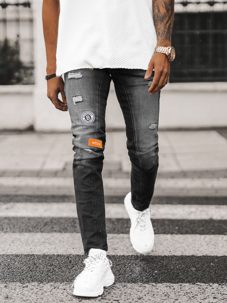 Spodnie mają fason typu slim fit, czyli z wąskimi nogawkami. Oryginalnego wyglądu nadaje im dekatyzowany wzór, przetarcia na nogawkach, łączenia materiału oraz ozdobne naszywki. Po bokach oraz z tyłu jeansów znajdują się kieszenie, do których można schować klucze, portfel czy telefon. Spodnie zostały wykonane z połączenia bawełny, poliestru oraz elastanu, dzięki czemu są wygodne w noszeniu, przyjemne w dotyku i ładnie dopasowują się do sylwetki.