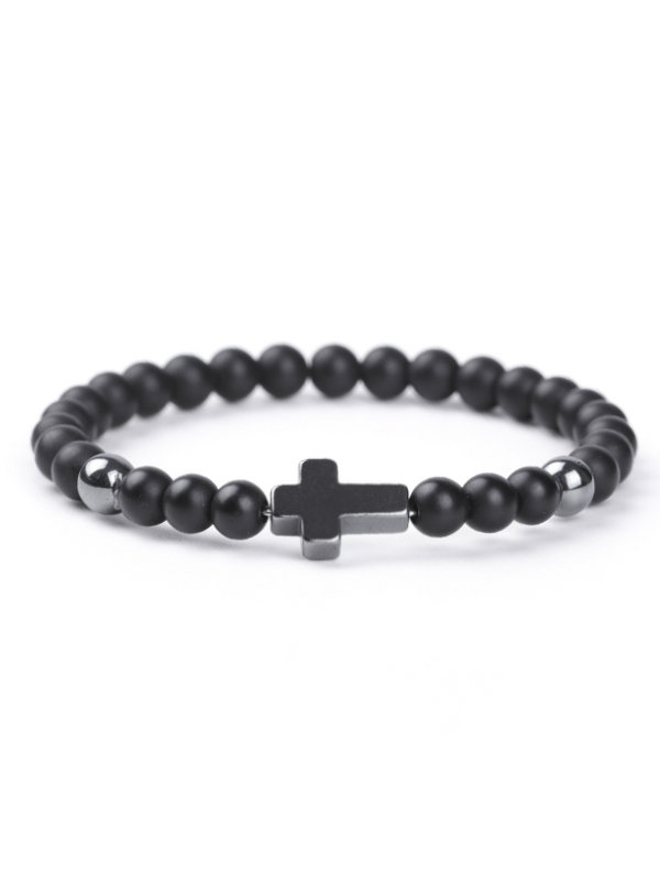 Bransoletka pochodzi z nowej kolekcji. Składa się z okrągłych, czarnych koralików oraz metalowych wstawek w kształcie krzyża. Znajdują się one na wytrzymałej, odpornej na zerwanie, rozciągliwej gumce, która z łatwością dopasowuje się do nadgarstka, gwarantując wysoki komfort noszenia.