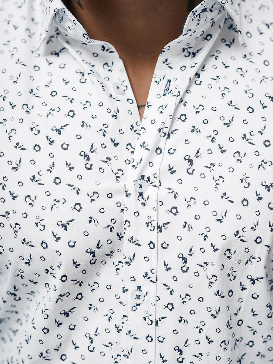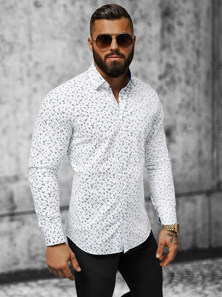 Koszula pochodzi z naszej nowej kolekcji. Ma długi rękaw, kołnierzyk typu kent i zapięcie na guziki. Zdobi ją subtelny, drobny, stylowy wzorek. Koszula została wykonana z bawełny z dodatkiem elastanu, co sprawia, że ładnie dopasowuje się do ciała, nie gniecie się, nadaje się do prania w pralce i jest wygodna w noszeniu oraz przyjemna w dotyku.