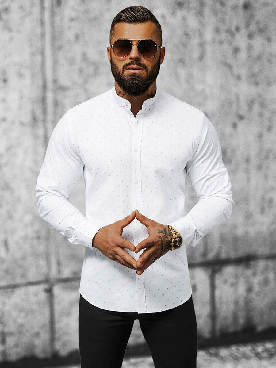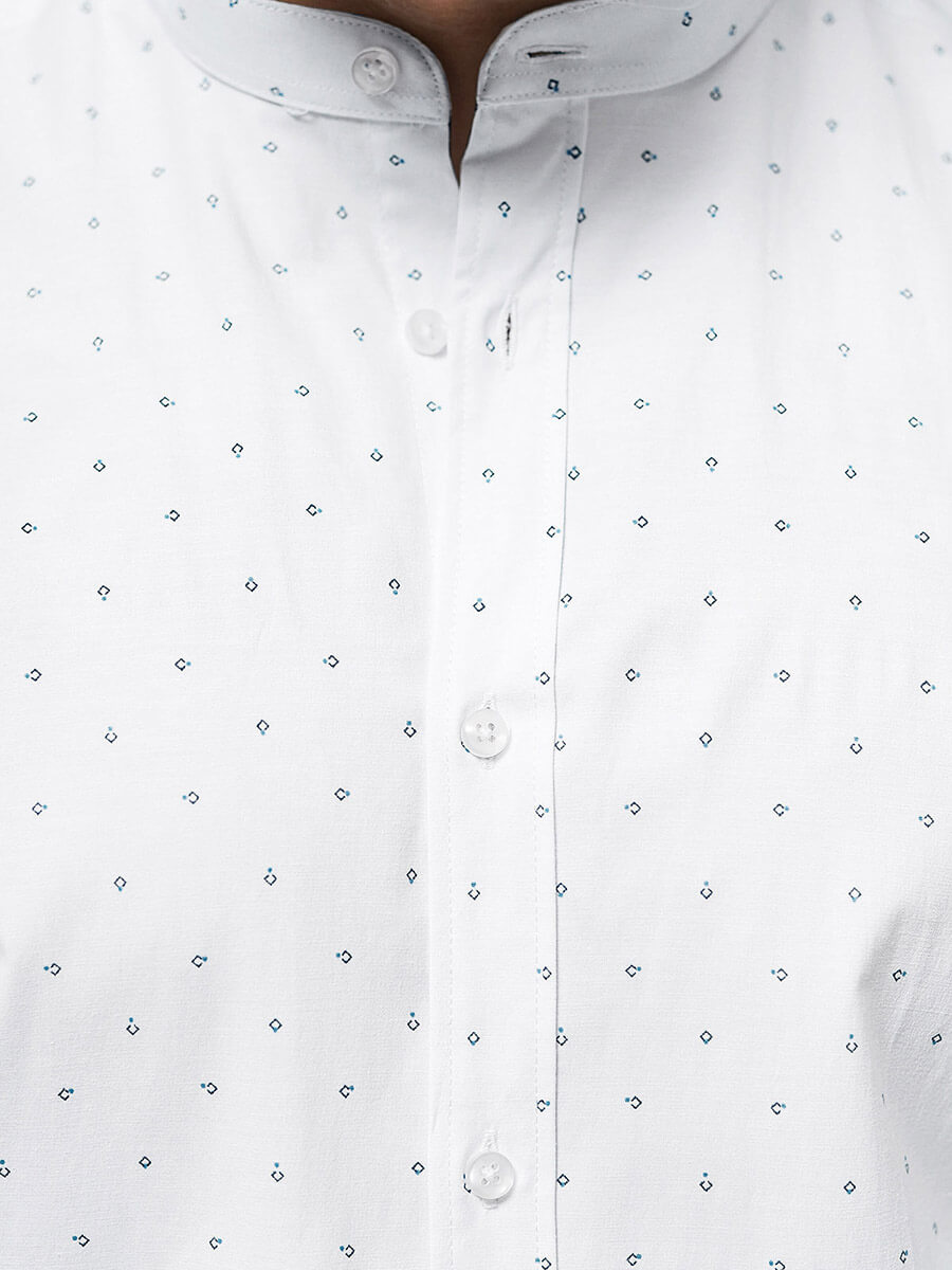 Koszula pochodzi z nowej kolekcji naszego sklepu internetowego. Występuje w kolorze białym i zdobi ją nadruk w małe, białe kropki. Koszula ma długi rękaw, zapięcie na guziki oraz kołnierz typu stójka, czyli okrywający szyję i pozbawiony wyłogów. Została ona wyprodukowana z połączenia bawełny, poliestru oraz elastanu. Taki skład sprawia, że jest wygodna w noszeniu, miła w dotyku, ładnie dopasowuje się do sylwetki i nie gniecie się.