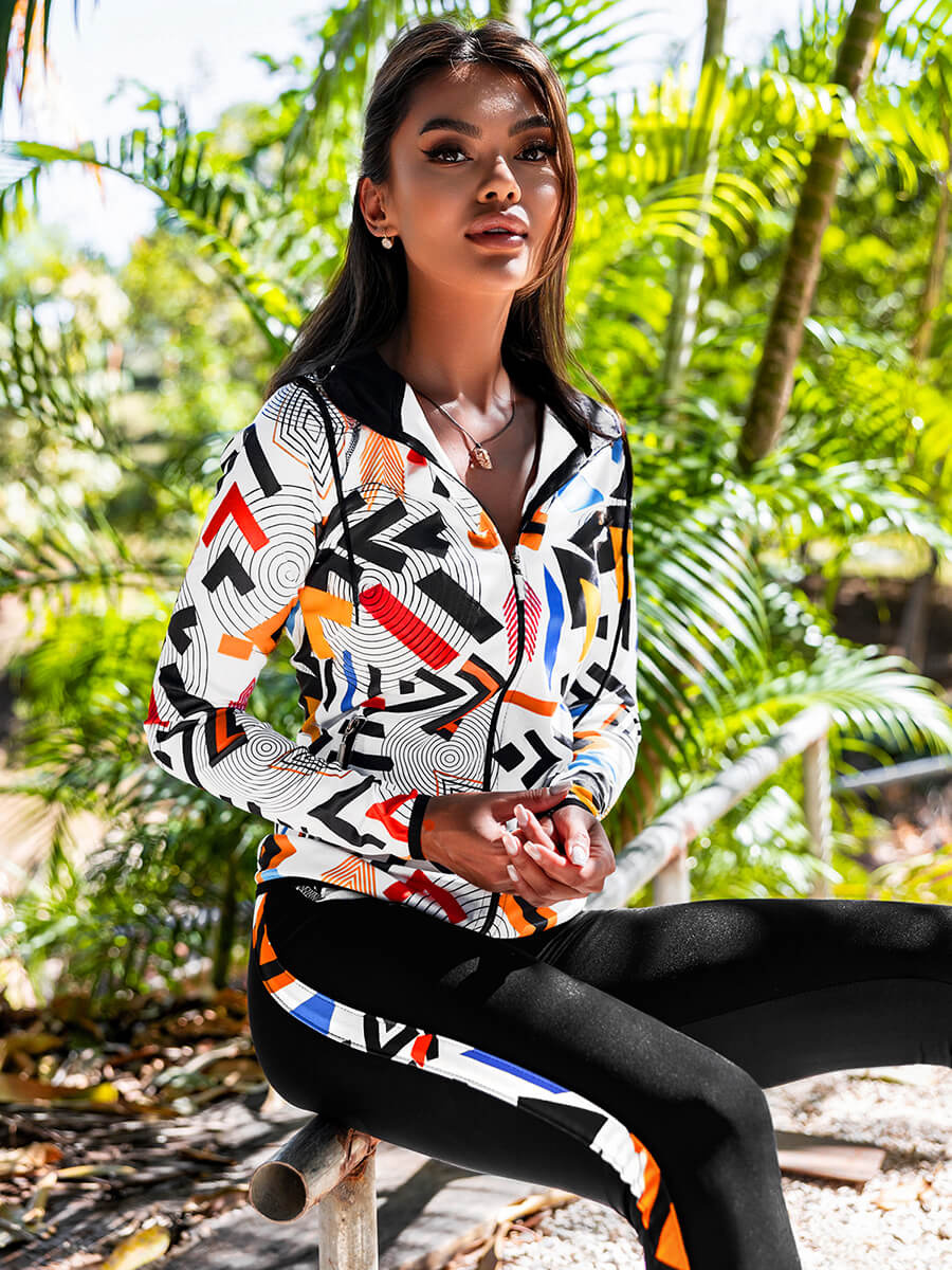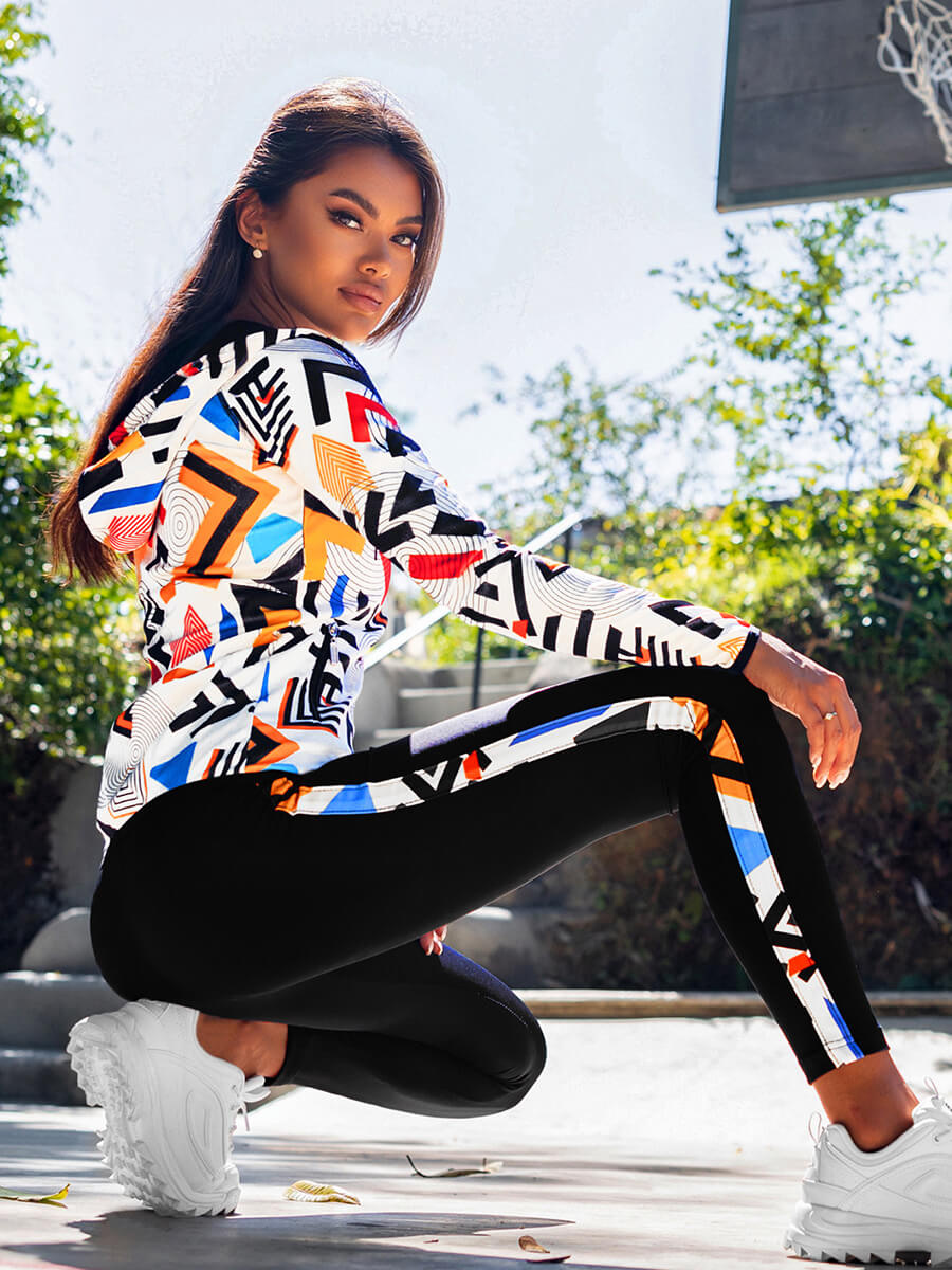 W skład dresowego kompletu damskiego wchodzą legginsy z kontrastowymi lampasami oraz rozpinana bluza z praktycznym kapturem i kieszeniami po bokach pokryta kolorowym wzorem. Zestaw został wykonany z wysokiej jakości poliestru z domieszką elastanu, dzięki czemu ładnie dopasowuje się do sylwetki i nie krępuje ruchów.