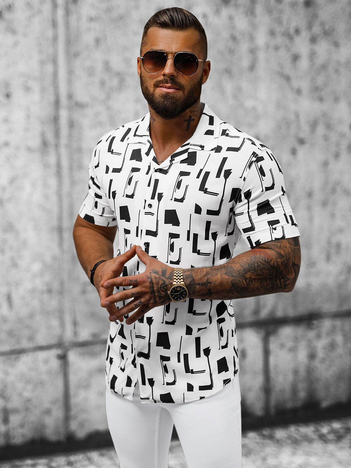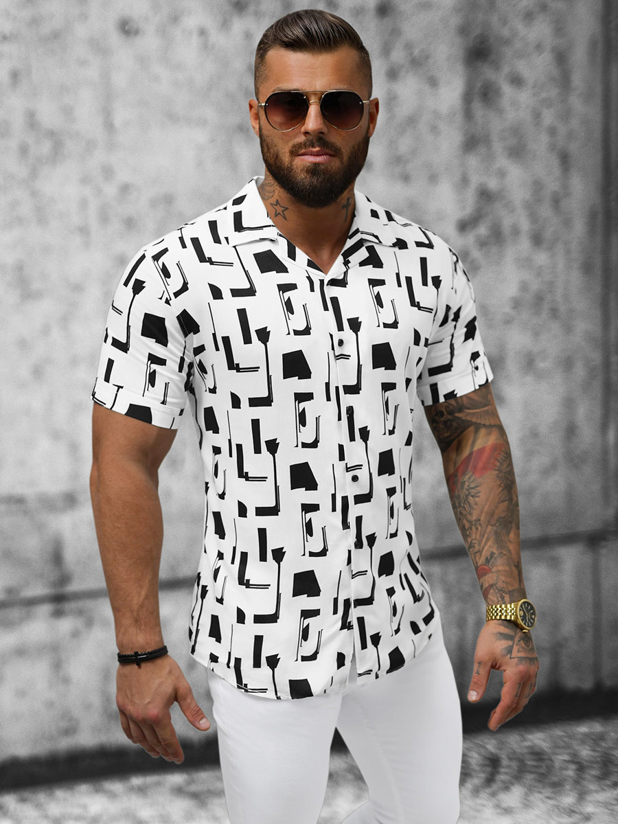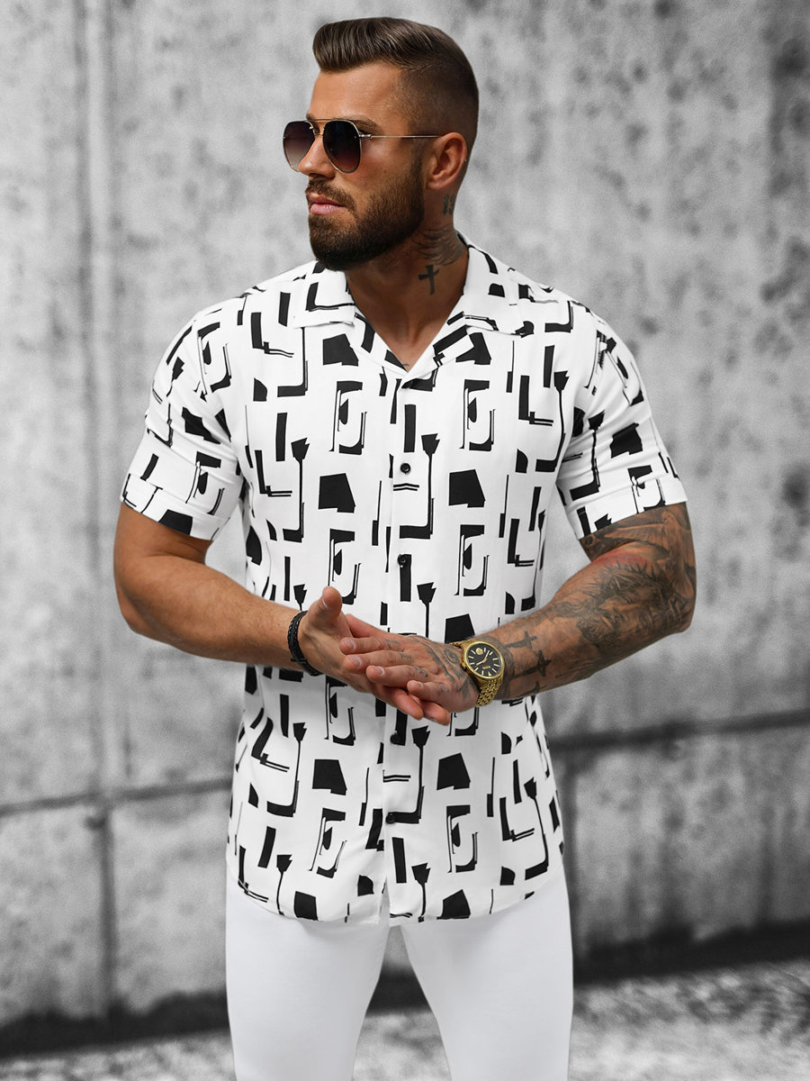 Męska koszula posiada: Zapinanie na guziki, Krótki rękaw, Kubański kołnierz, Designerski wzór