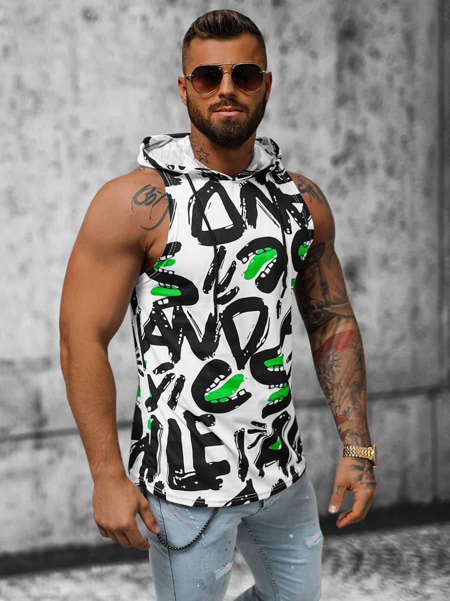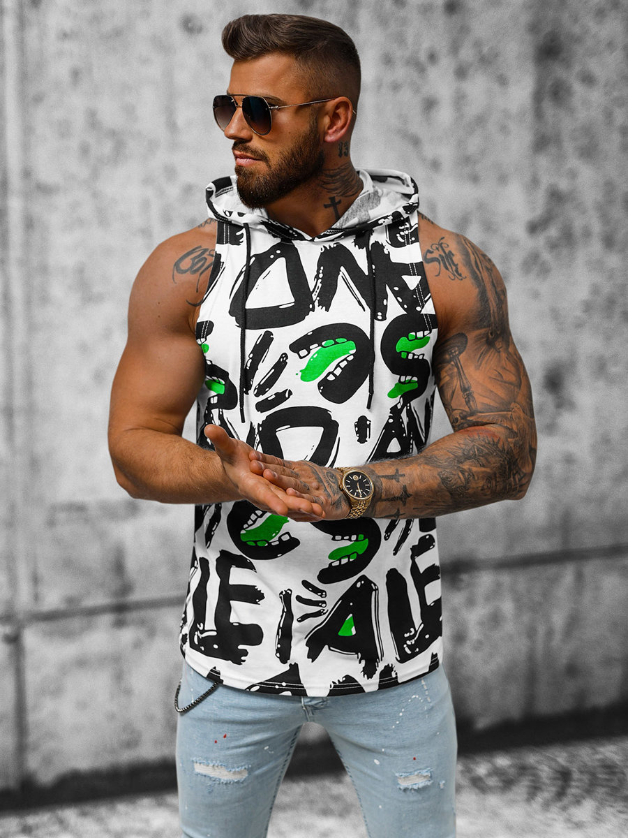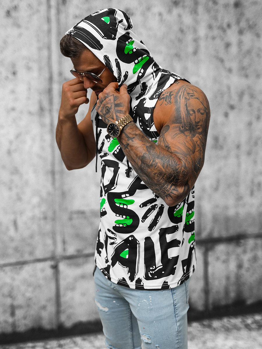 Koszulka pochodzi z naszej najnowszej kolekcji. Została wykonana z wysokiej jakości bawełny oraz poliestru, dzięki czemu jest wygodna w noszeniu, przyjemna w dotyku, ładnie dopasowuje się do sylwetki, nie rozciąga i nie gniecie. Posiada praktyczny kaptur, który bardzo dobrze sprawdzać będzie się w chłodne, wietrzne dni. Z przodu oraz z tyłu koszulki znajduje się oryginalny, przykuwający wzrok nadruk. Jest ona pozbawiona rękawów.
