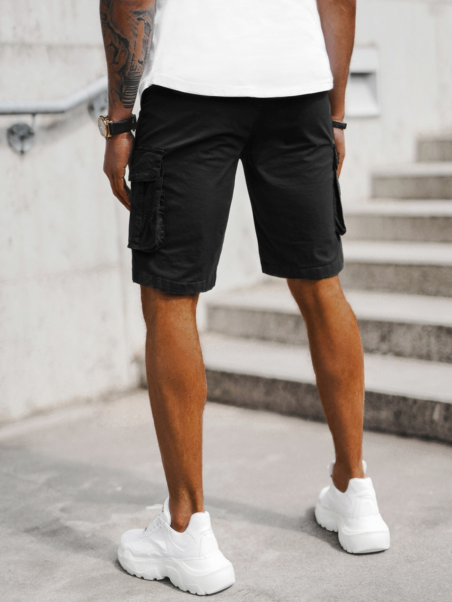 Spodenki pochodzą z najnowszej kolekcji. Mają fason typu bojówki, którego cechą charakterystyczną jest obecność dużej ilości kieszeni. W tym przypadku znajdują się one zarówno z przodu, jak i z tyłu oraz po bokach. Kieszenie z łatwością pomieszczą wszystkie niezbędne drobiazgi, takie jak klucze, portfel czy telefon. Spodenki zostały wykonane z wysokiej jakości bawełny z domieszką elastanu, dzięki czemu są wygodne w noszeniu, miękkie, przyjemne w dotyku i ładnie układają się na ciele.