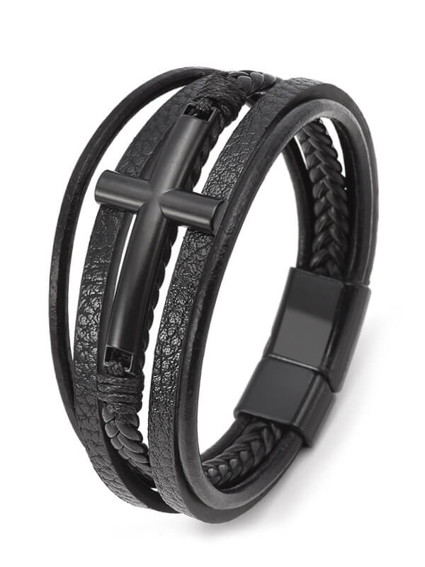 Komplet składa się z zestawu bransoletek wykonanych z wysokiej jakości skóry ekologicznej o plecionym wzorze oraz rzemyków w kolorze czarnym. Na przodzie znajduje się ozdobna metalowa wstawka. Obwód bransoletek jest regulowany sznurkami w zakresie od 16 do 24 centymetrów. Jedna z nich jest zapinana na napy i ma obwód 20 centymetrów.