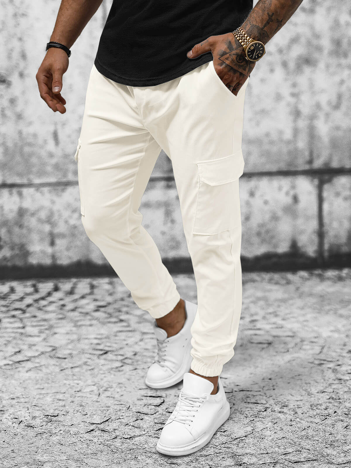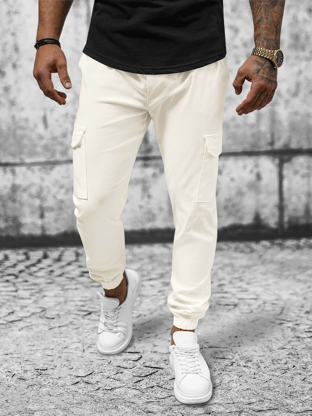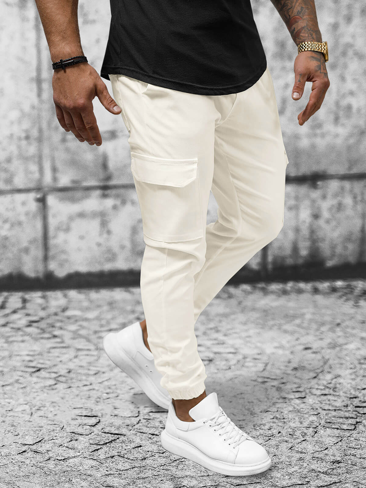 Szczegóły: Ściągacze przy nogawkach i pasie, Kieszenie z przodu i po bokach, Jedna kieszeń z tyłu.