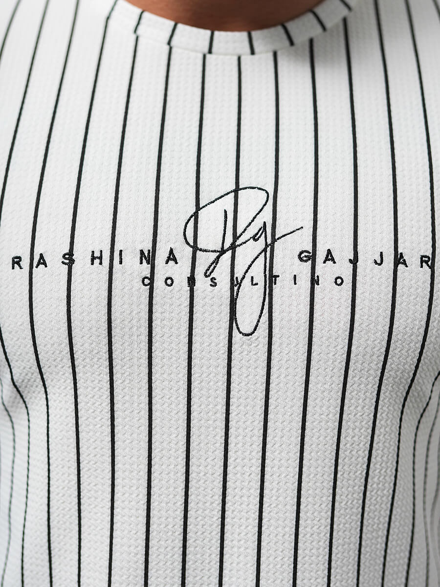 Koszulka pochodzi z najnowszej kolekcji naszego sklepu internetowego. Ma klasyczny, okrągły dekolt typu U-neck. Z przodu oraz z tyłu t-shirtu znajdują się pionowe pasy, które optycznie wysmuklają i wydłużają sylwetkę. Dodatkowo, na środku umieszczono nadruk w formie napisu. Koszulka została wyprodukowana z wysokiej jakości poliestru z domieszką elastanu, co sprawia, że ładnie dopasowuje się do ciała, nie gniecie się, szybko schnie i jest odporna na zaplamienia.