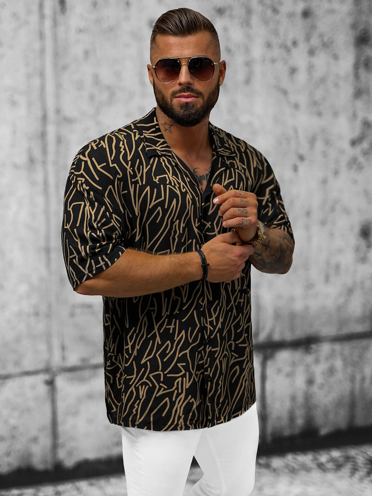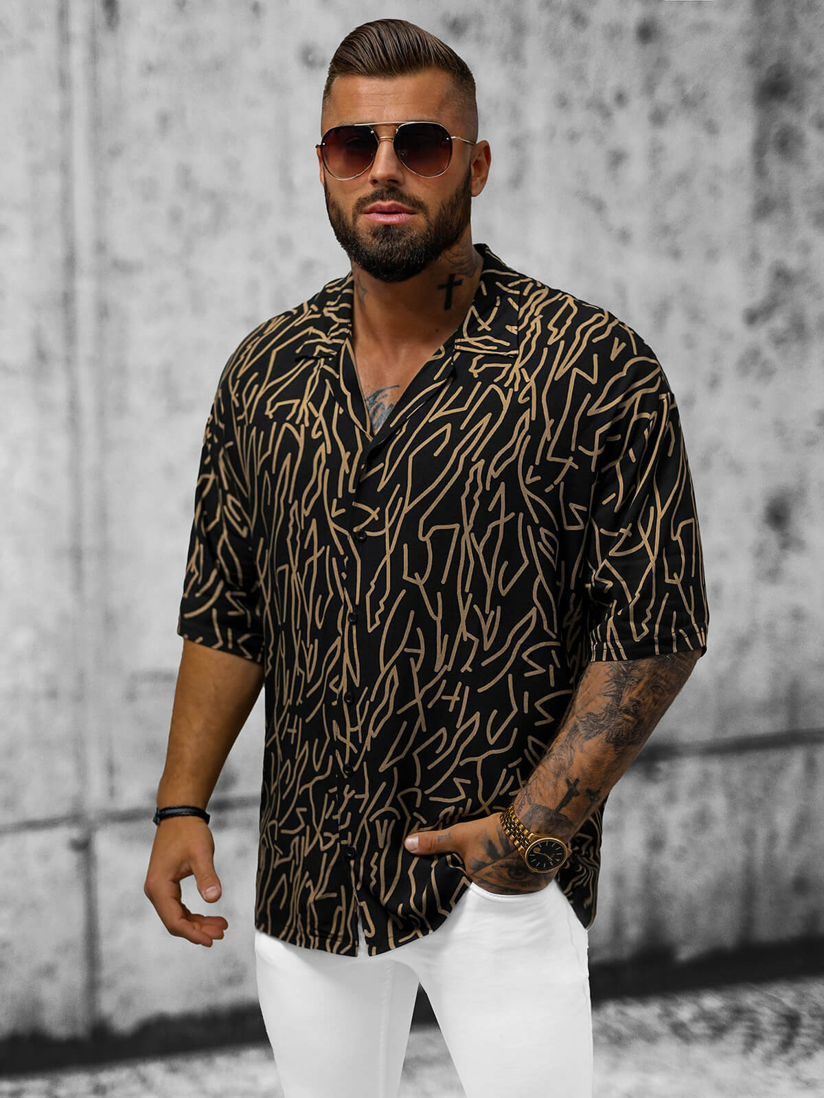 Koszula jest zapinana na guziki, co dodaje jej funkcjonalności i łatwości w użytkowaniu. Posiada krótki rękaw - idealny na ciepłe dni lub do stylizacji z marynarką. Kubański kołnierz to kolejny atut tej koszuli, nadając jej niepowtarzalnego charakteru i świeżości. Abstrakcyjny wzór w kolorze złotym dodaje jej elegancji i oryginalności.