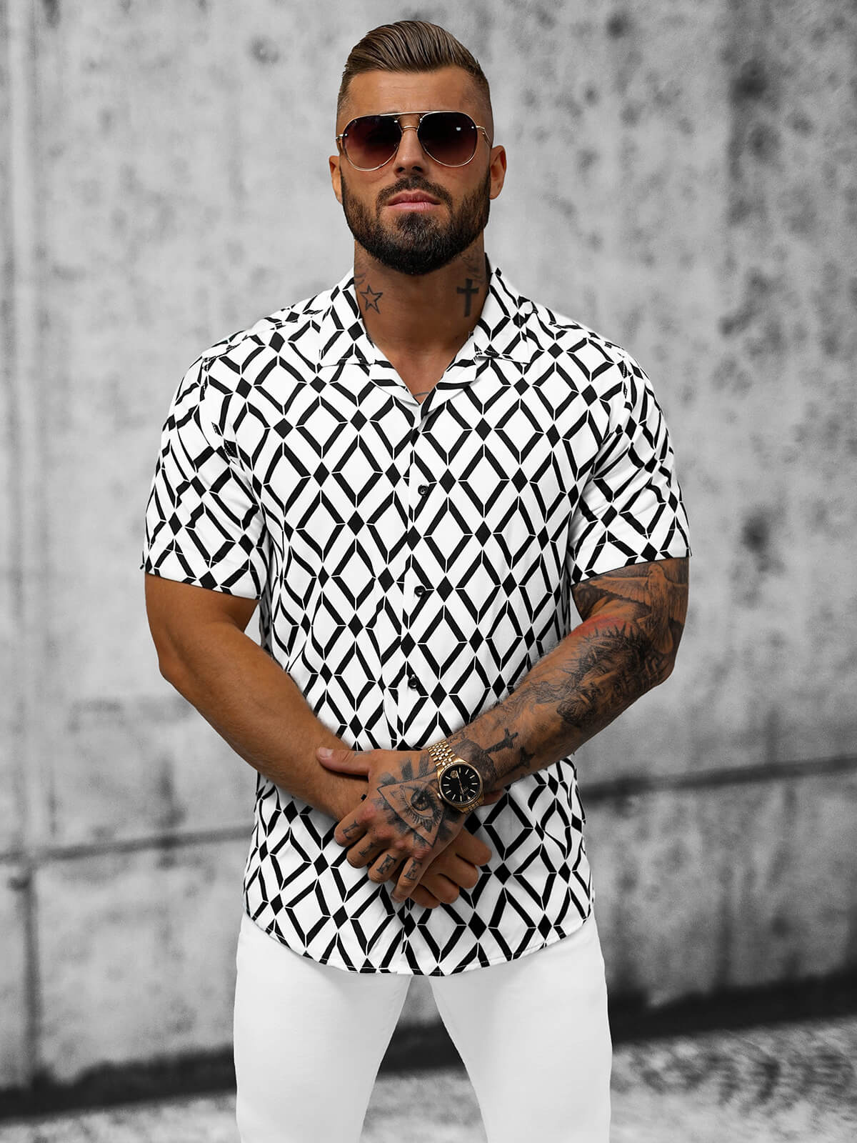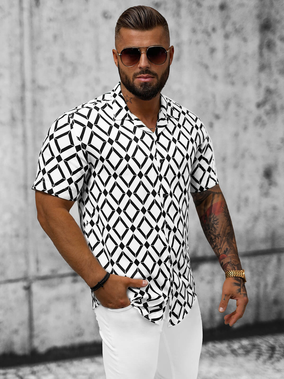 Podkreśl swój styl z naszą biało-czarną męską koszulą Ozonee E/1400/139Z z najnowszej kolekcji. Koszula, zapinana na guziki, wykonana jest z przewiewnej bawełny, co zapewnia komfort noszenia przez cały dzień. Szczególny akcent dodają krótkie rękawy i kubański kołnierz, które nadają koszuli unikalny charakter.