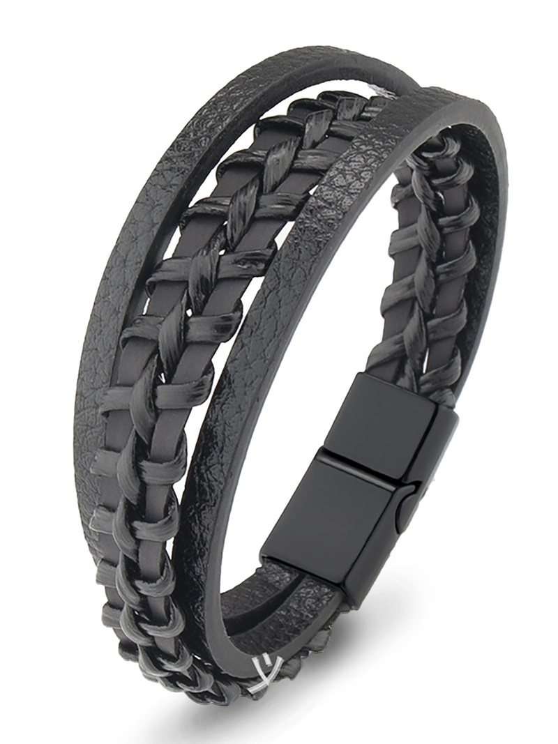 Komplet składa się z zestawu bransoletek wykonanych z wysokiej jakości skóry ekologicznej o plecionym wzorze oraz rzemyków w kolorze czarnym. Na przodzie znajduje się ozdobna metalowa wstawka. Obwód bransoletek jest regulowany sznurkami w zakresie od 16 do 24 centymetrów. Jedna z nich jest zapinana na napy i ma obwód 20 centymetrów.