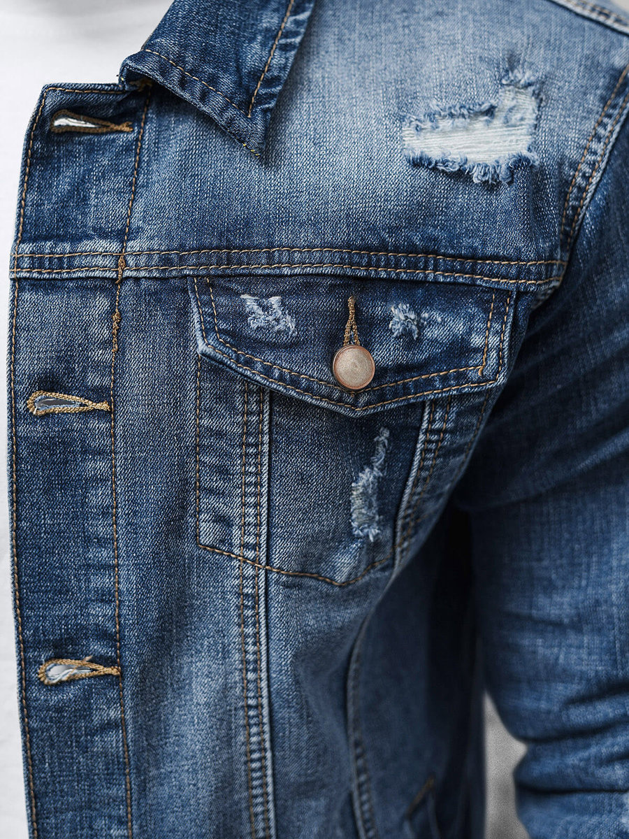 Nasza kurtka męska zapinana jest na guziki, co ułatwia jej zakładanie i zdejmowanie. Posiada praktyczne kieszenie po bokach oraz kieszenie z przodu na guziki. Dodatkowo, modny efekt przetarć nadaje jej nieco swobodnego charakteru.