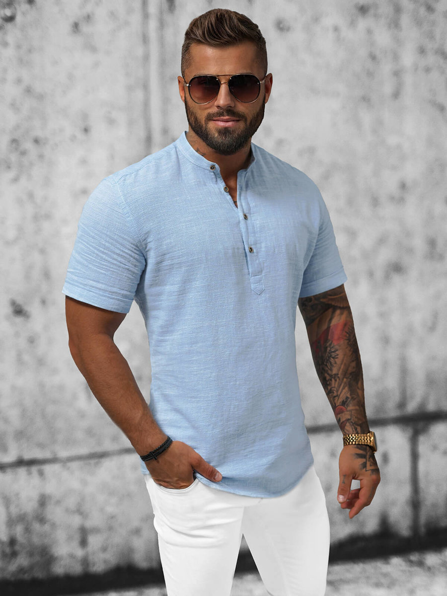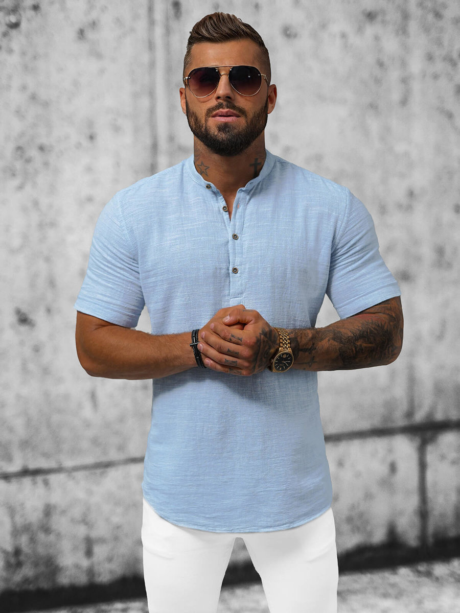 Kluczowe Cechy: Zapinana do połowy na guziki, Kołnierz typu stójka, Krótkie rękawy.