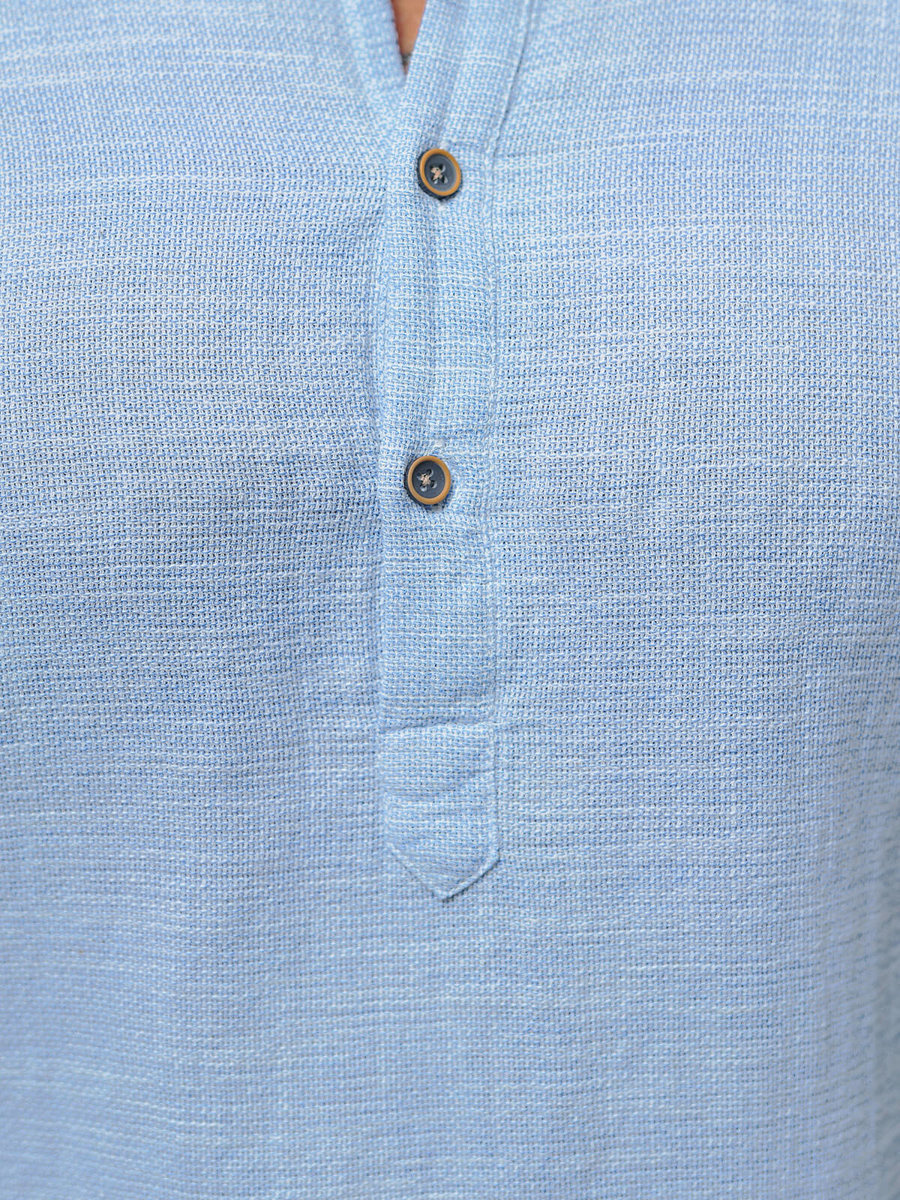 Koszula posiada krótkie rękawy, co sprawia, że jest idealnym wyborem na ciepłe, letnie dni. Górna część koszuli zapinana jest na guziki, co dodaje jej niepowtarzalnego charakteru. Klasyczny kołnierz typu stójka podkreśla elegancję i styl, a przewiewny materiał gwarantuje najwyższy komfort noszenia.