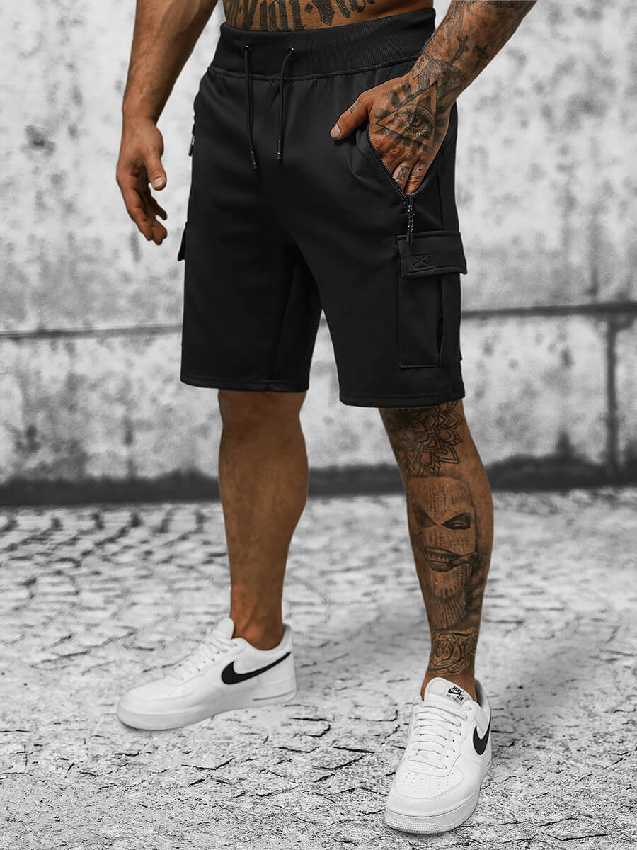 Spodenki pochodzą z najnowszej kolekcji naszego sklepu internetowego. Występują w ponadczasowym kolorze czarnym, dzięki czemu będą dobrze pasowały do każdej stylizacji. W pasie posiadają praktyczny ściągacz chroniący przed zsuwaniem się. Spodenki mają kieszenie z przodu na zamek błyskawiczny, po bokach na rzepy oraz jedną z tyłu. Dzięki temu z łatwością pomieszczą wszystkie niezbędne drobiazgi, takie jak portfel czy klucze. Spodenki zostały wyprodukowane z poliestru. Sprawia to, że ładnie się układają, nie gniotą, nie rozciągają i są odporne na uszkodzenia oraz zaplamienia.