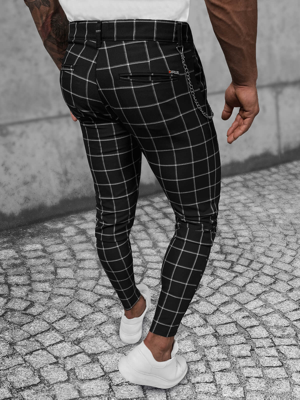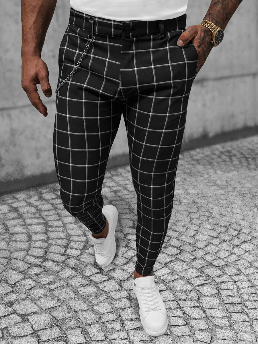 Prezentujemy eleganckie spodnie męskie typu chino marki Ozonee, model DJ/550174, w klasycznym czarnym kolorze, które pochodzą z najnowszej kolekcji. Posiadają modny wzór w kratkę, zamki przy nogawkach, kieszenie z przodu i z tyłu oraz ozdobny, odpinany łańcuch.