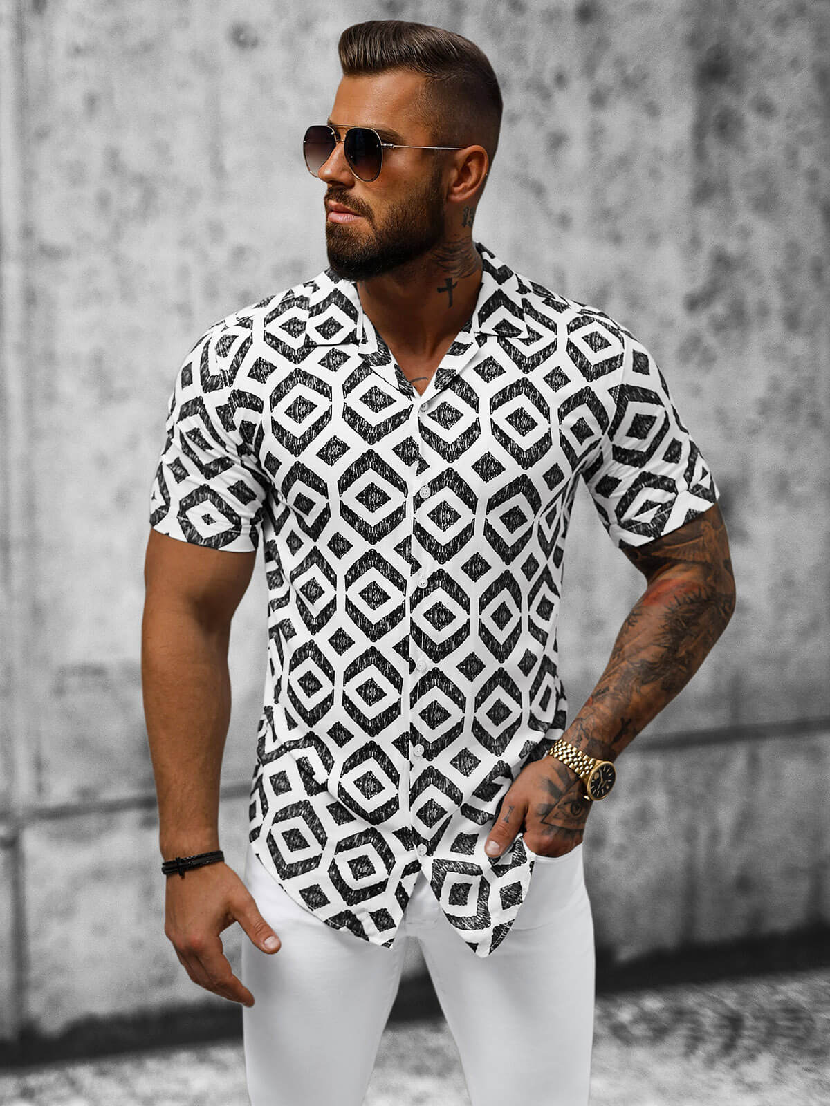 Cechy męskiej koszuli: Klasyczne zapinanie na guziki, Krótkie rękawy, Kubański kołnierz, Oryginalny wzór w romby