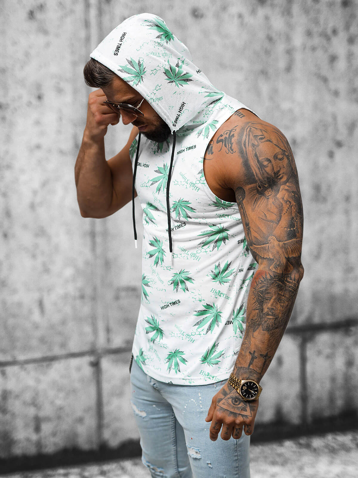 Koszulka pochodzi z nowej kolekcji. Jej przód i tył zdobi oryginalny, przykuwający wzrok nadruk z motywem liści. T-shirt jest pozbawiony rękawów. Posiada praktyczny kaptur, który bardzo dobrze sprawdzać będzie się w nieco chłodniejsze, wietrzne dni. Bluzka została wykonana z połączenia najwyższej jakości bawełny oraz poliestru. Sprawia to, że jest bardzo wygodna w noszeniu, miękka, przyjemna w dotyku i ładnie dopasowuje się do sylwetki.