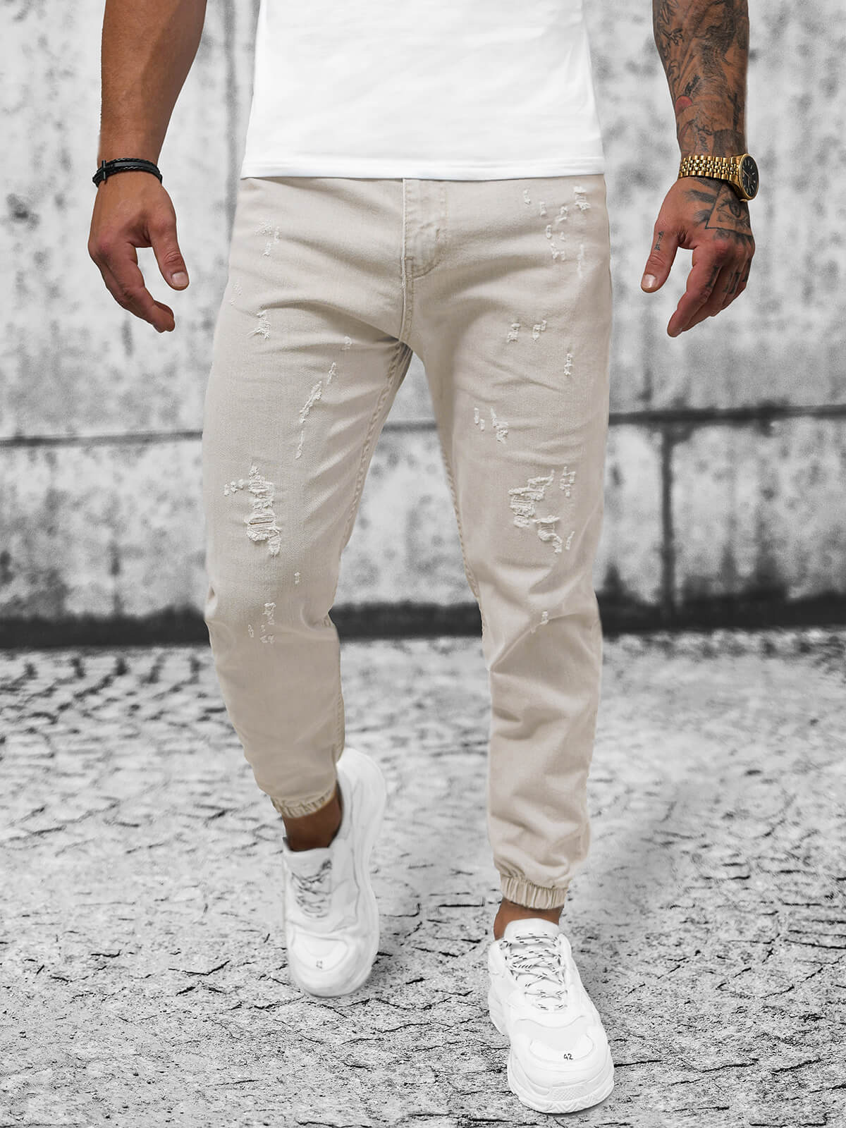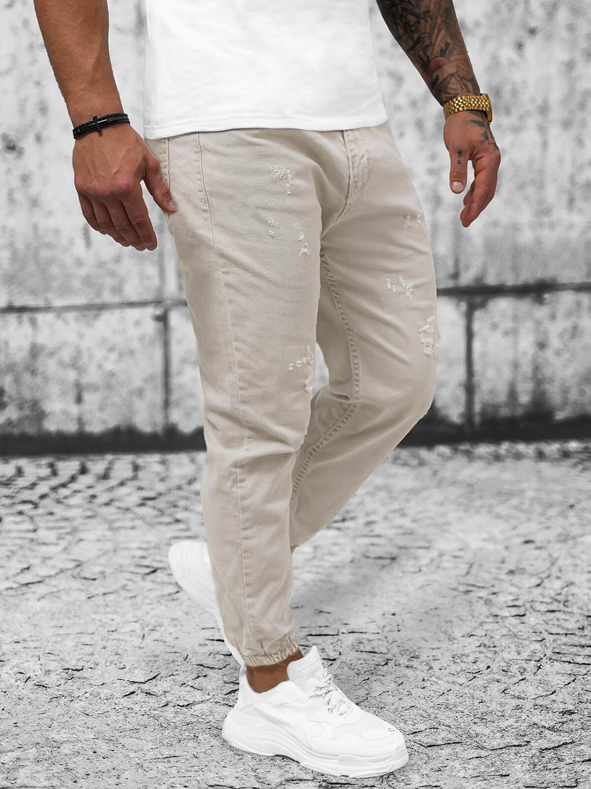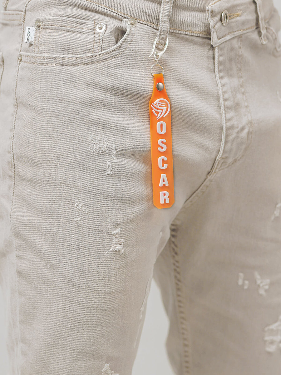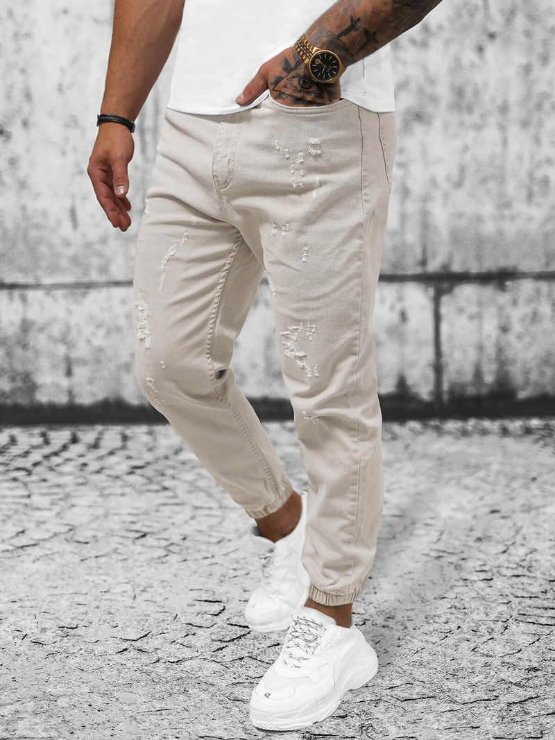 Główne cechy produktu: Lekko obniżony krok, Przetarcia na nogawkach, Kieszenie z przodu i z tyłu, Nogawki wykończone ściągaczami, Ozdobny odpinany brelok.