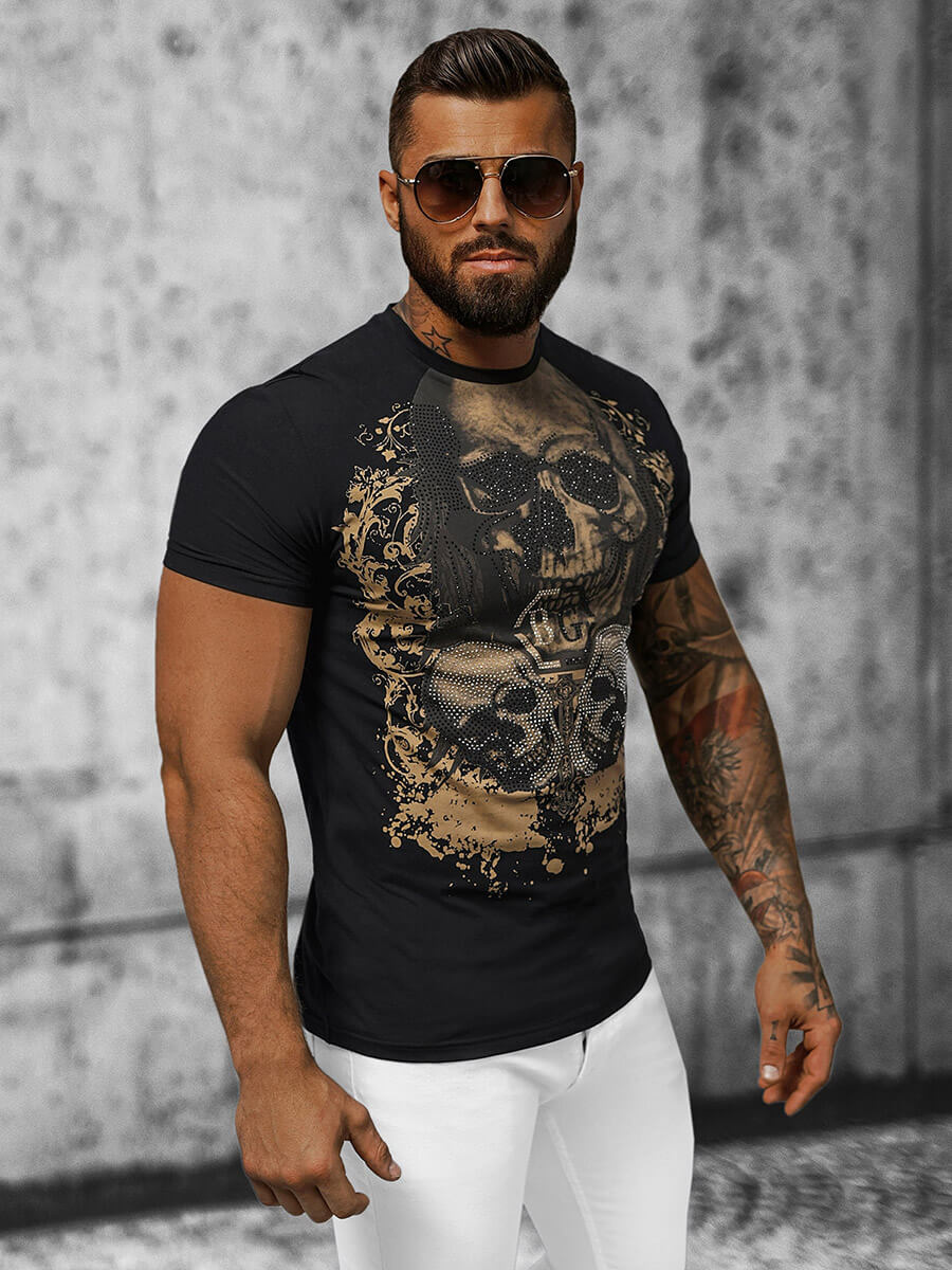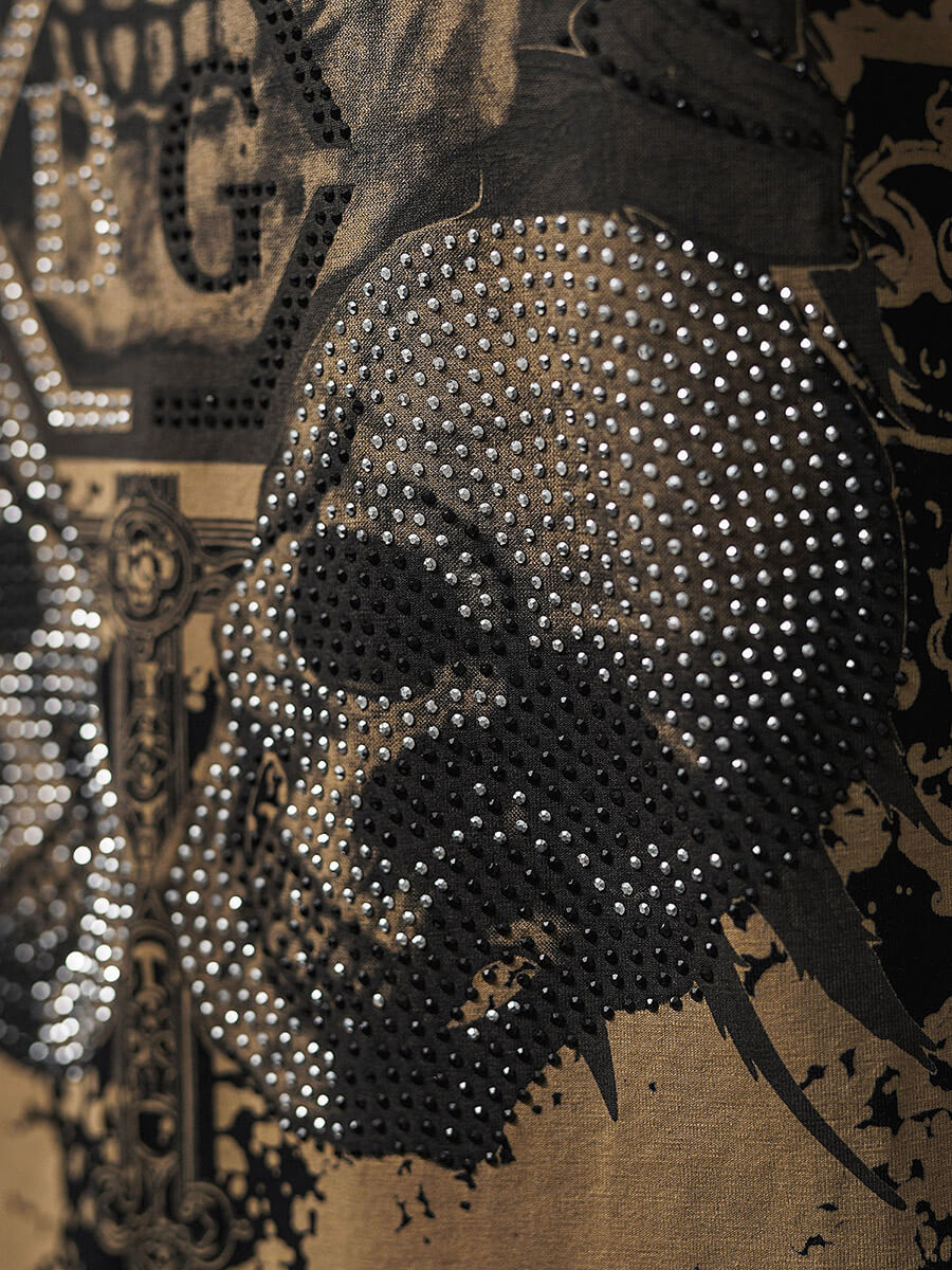 Koszulka pochodzi z naszej najnowszej kolekcji. Ma fason typu slim fit, czyli dopasowana do sylwetki. Oryginalnego wyglądu nadaje jej znajdujący się z przodu oraz tyłu nadruk i połyskujące cyrkonie. T-shirt został wyprodukowany z wysokiej jakości bawełny z domieszką elastanu, dzięki czemu jest wygodny w noszeniu, przyjemny w dotyku, ładnie układa się na ciele, nie rozciąga się z czasem i nie gniecie.