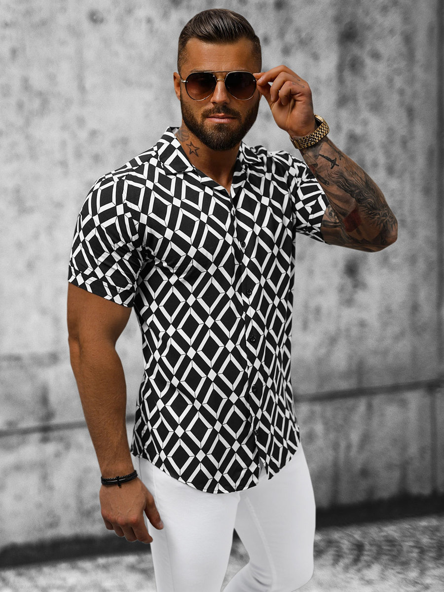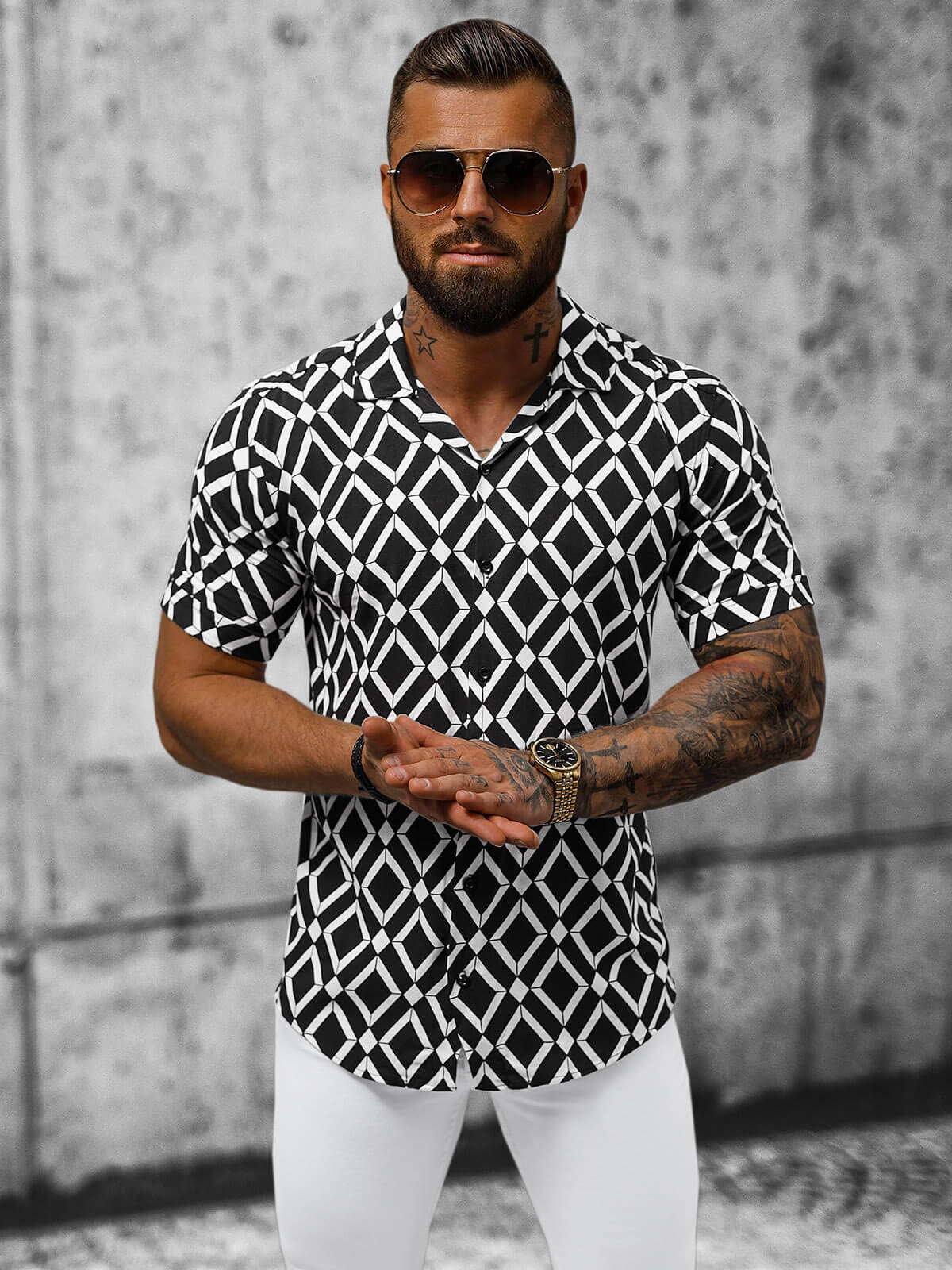 Męska koszula posiada: Zapinanie na guziki, Krótki rękaw, Kubański kołnierz, Designerski wzór