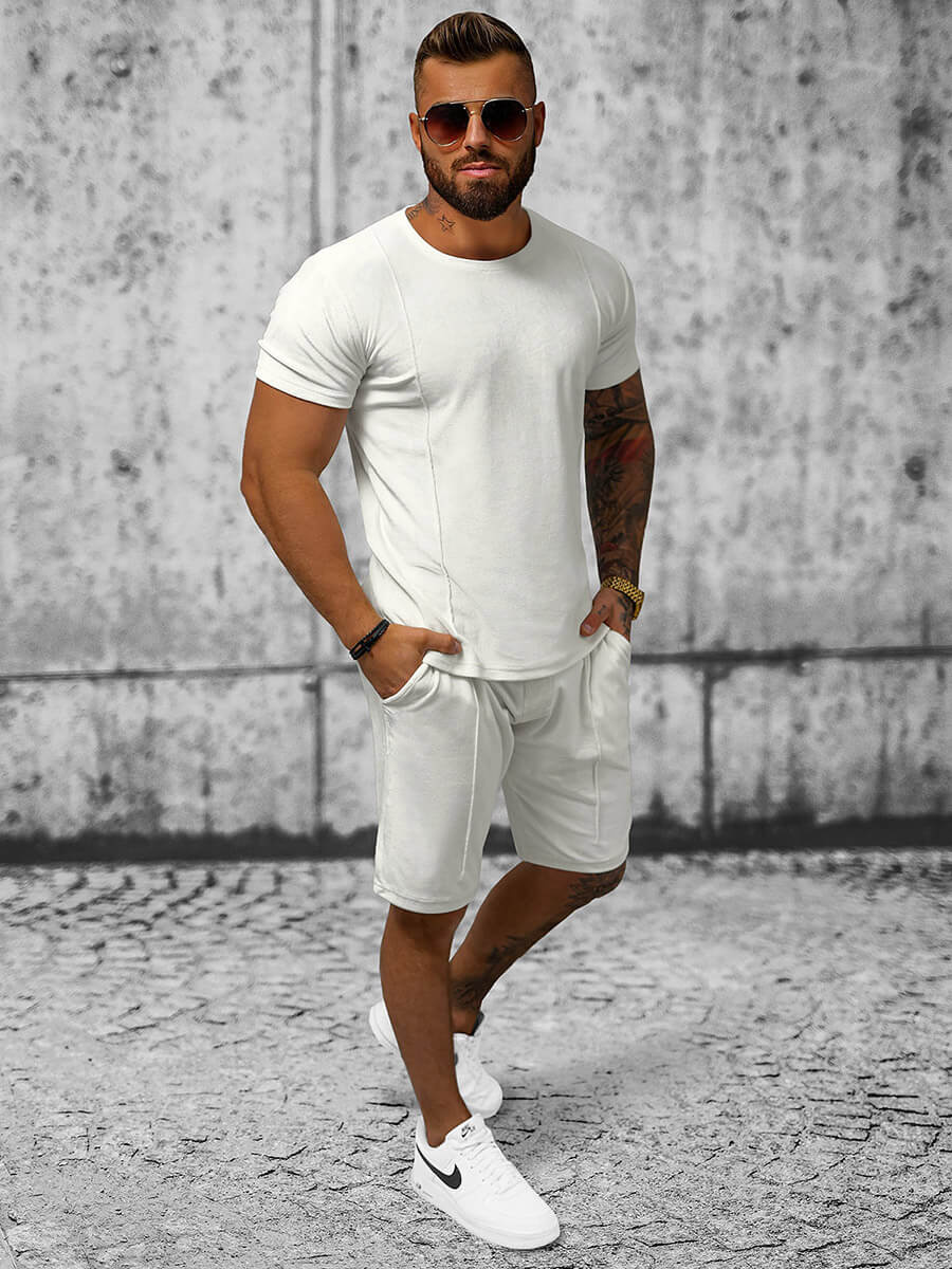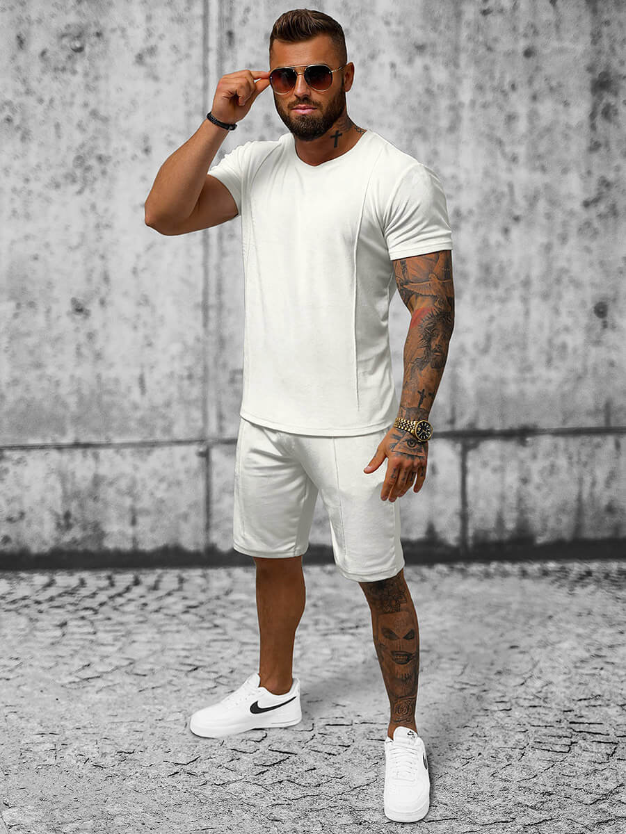 - W SKŁAD WCHODZI KOSZULKA Z KRÓTKIM RĘKAWEM ORAZ SPODENKI Z KIESZENIAMI PO BOKACH