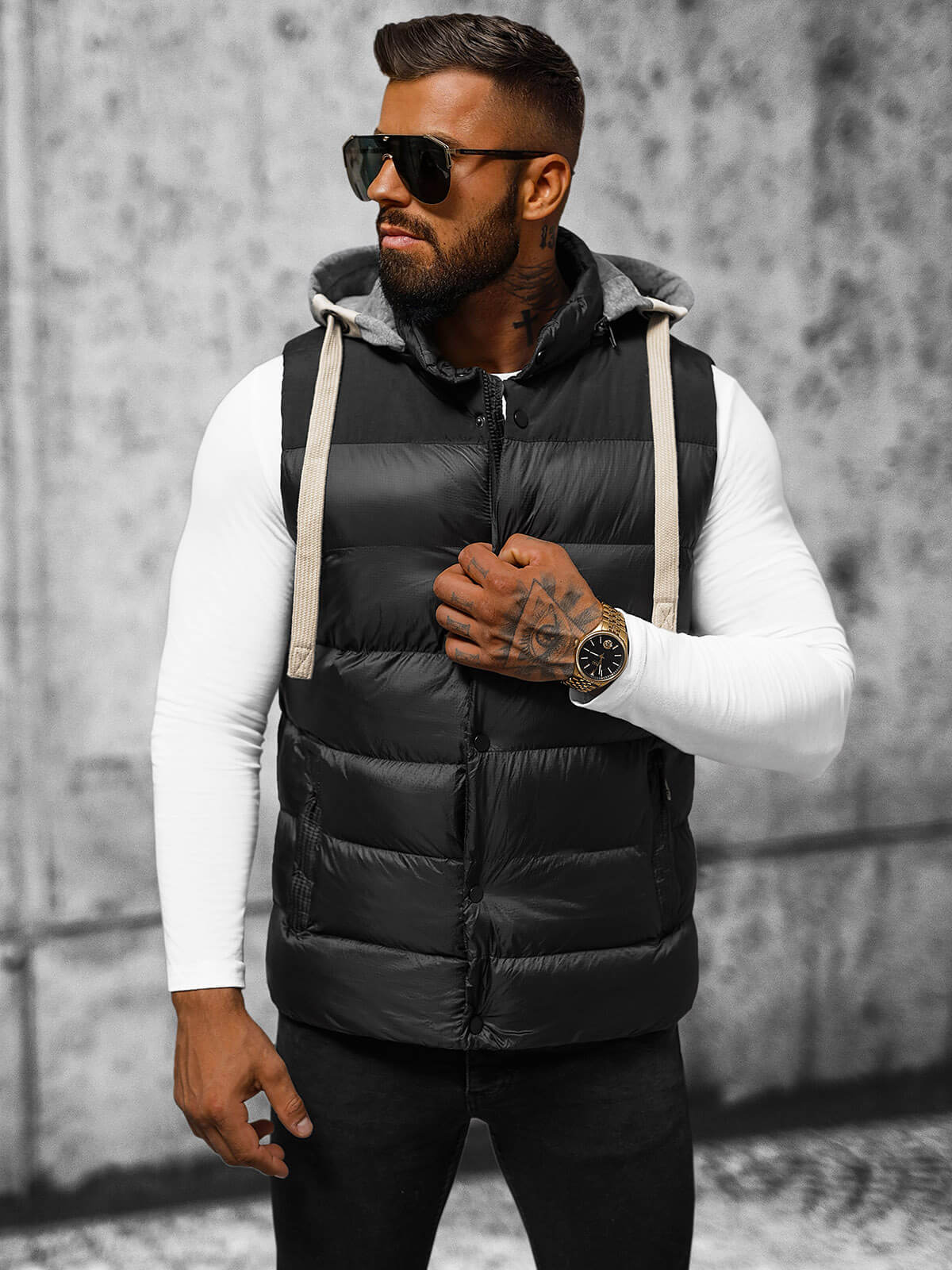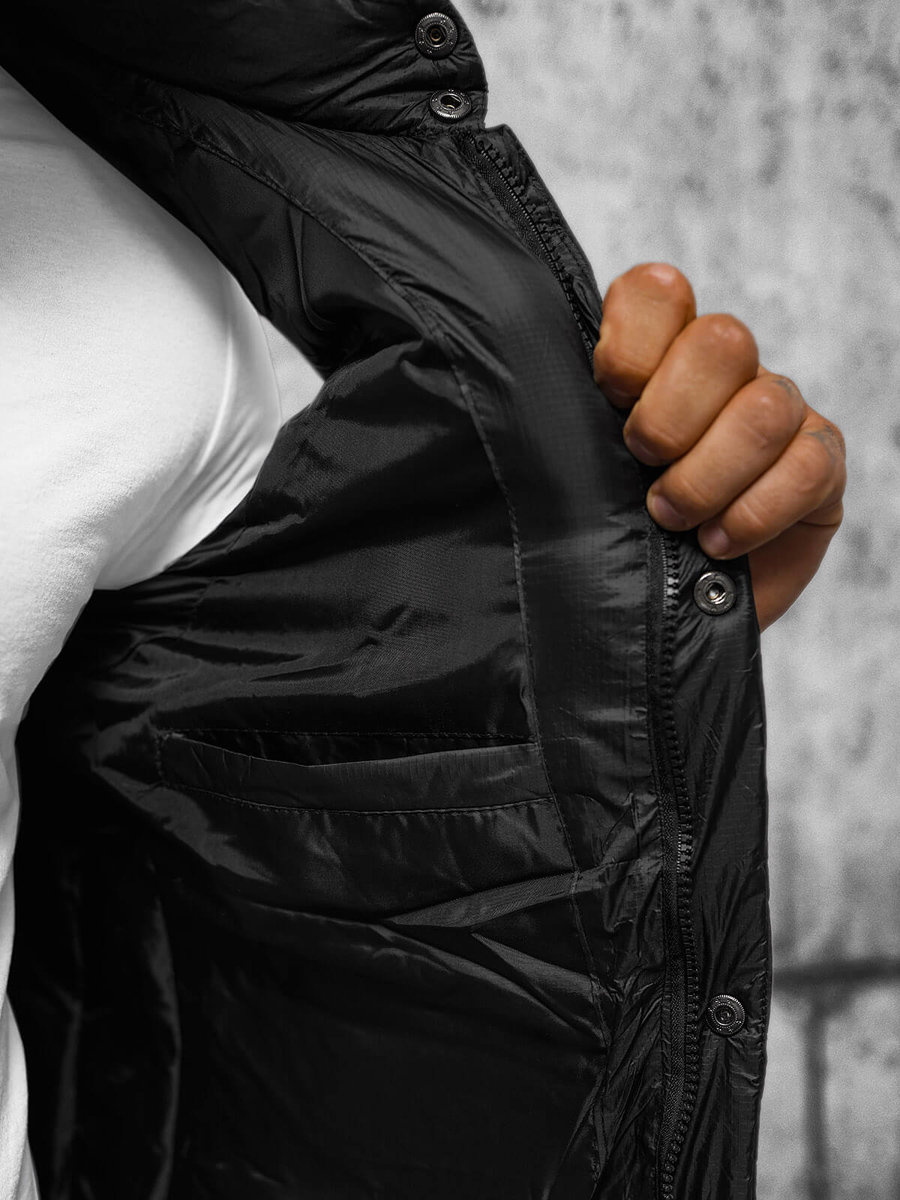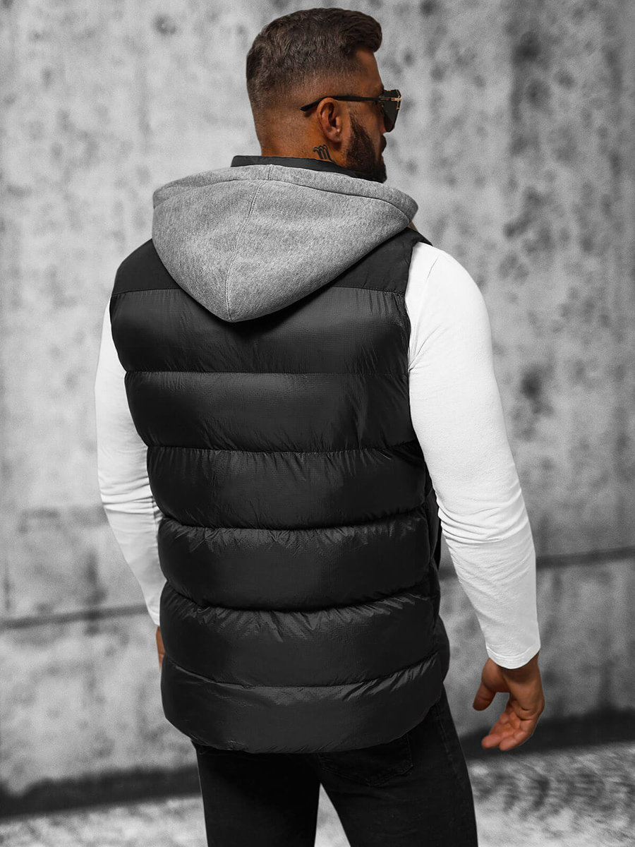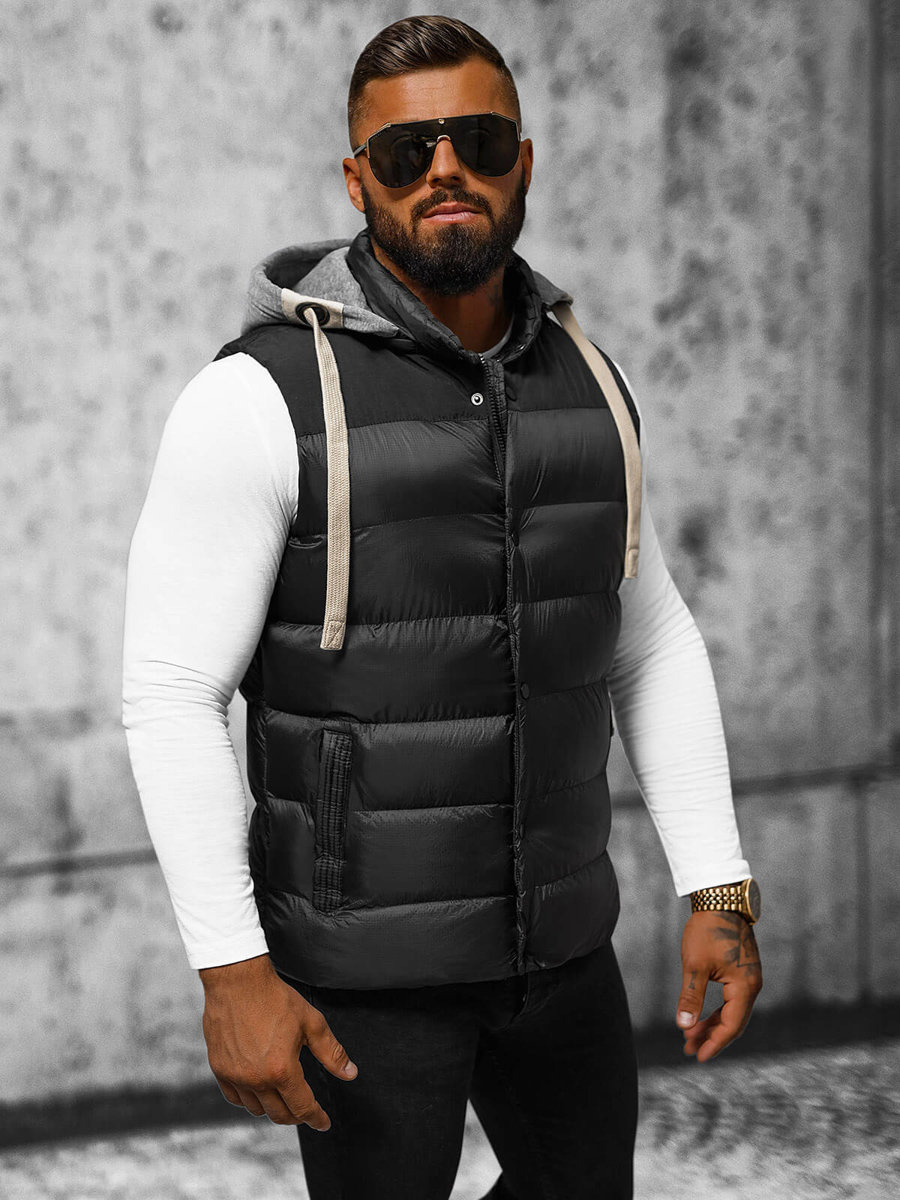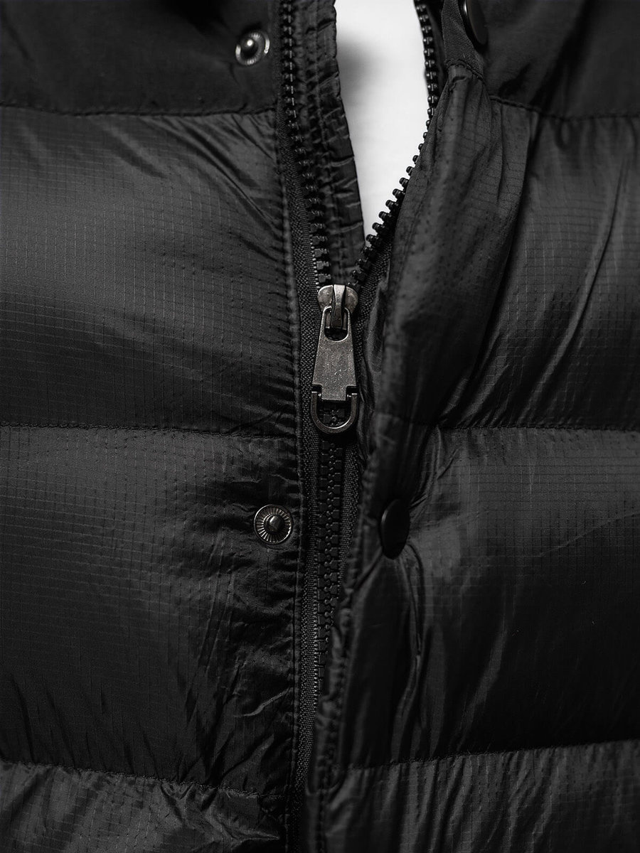 Kamizelka męska w kolorze czarnym, zapinana na zamek i napy, łączy w sobie nowoczesność i praktyczność. Odpinany kaptur imitujący bluzę i modne pikowania dodają jej unikalnego charakteru. Wyposażona w kieszenie po bokach na zamek, wykonana z 100% nylonu, a podszewka z 100% poliestru, to idealna kamizelka na co dzień i na specjalne okazje. Model (182 cm, 87 kg) ma na sobie rozmiar L.