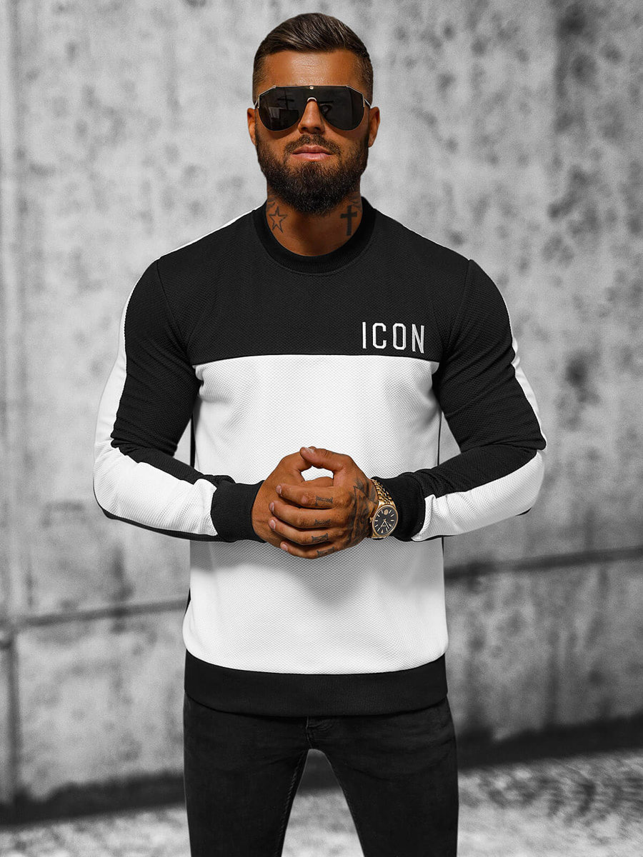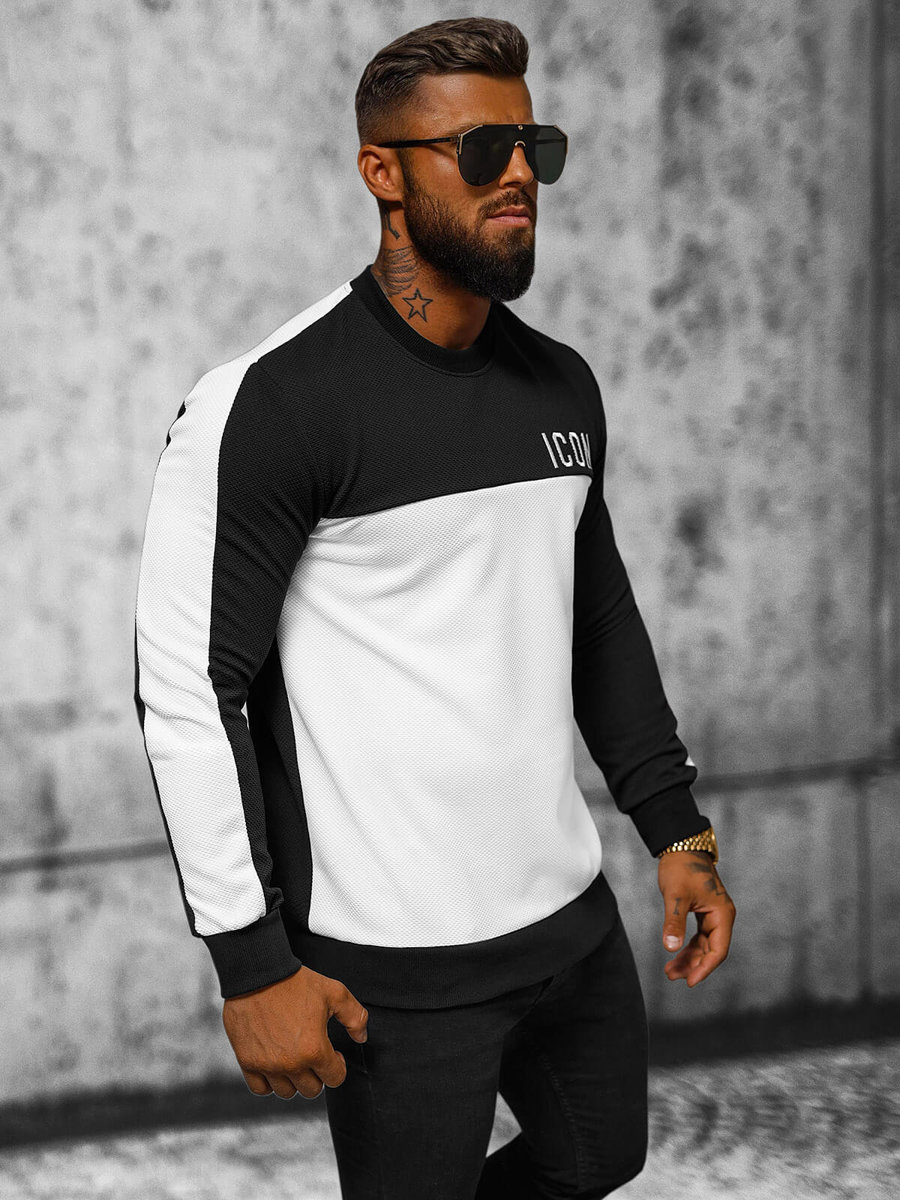 Model na zdjęciu ma 182 cm wzrostu i waży 87 kg. Prezentuje rozmiar XL. Ta bluza męska biało-czarna OZONEE O/P2032 jest idealna dla mężczyzn, którzy cenią sobie wygodę, styl i wysoką jakość wykonania.