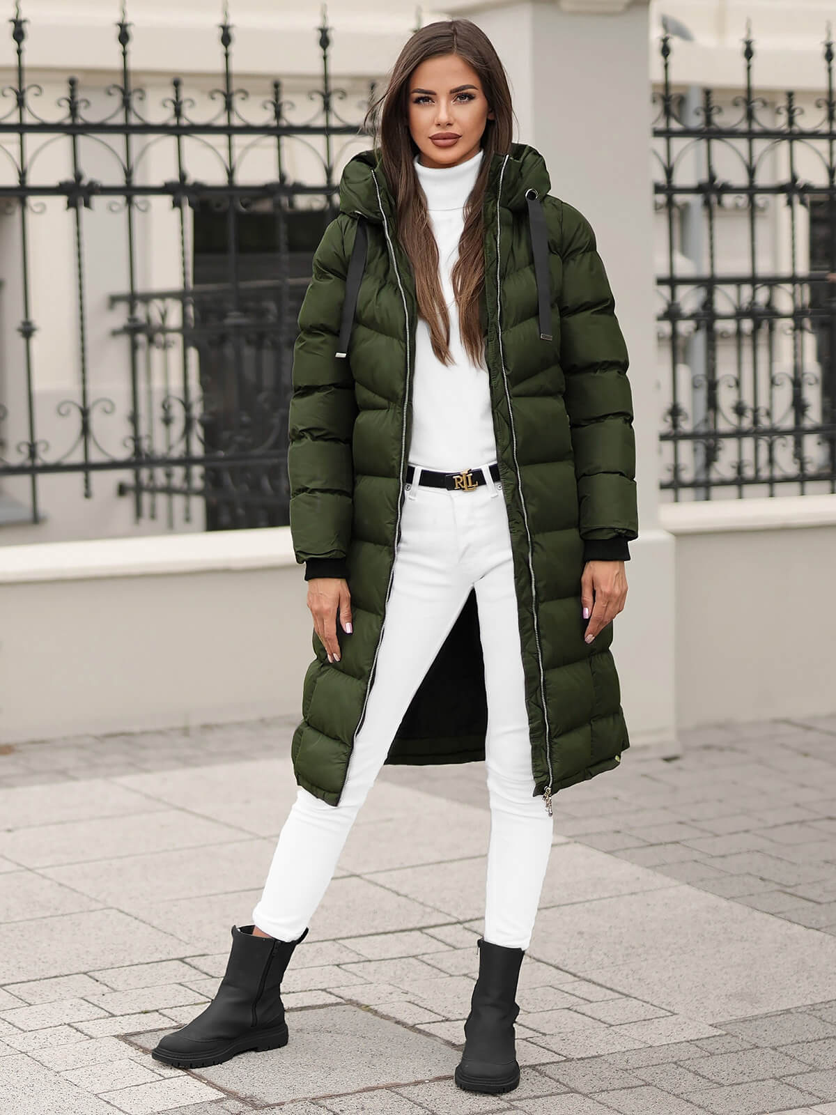 Modelka na zdjęciu ma 178 cm wzrostu i prezentuje kurtkę w rozmiarze M. Długa damska kurtka z najnowszej kolekcji to doskonały wybór dla kobiet, które cenią sobie zarówno styl, jak i komfort noszenia.