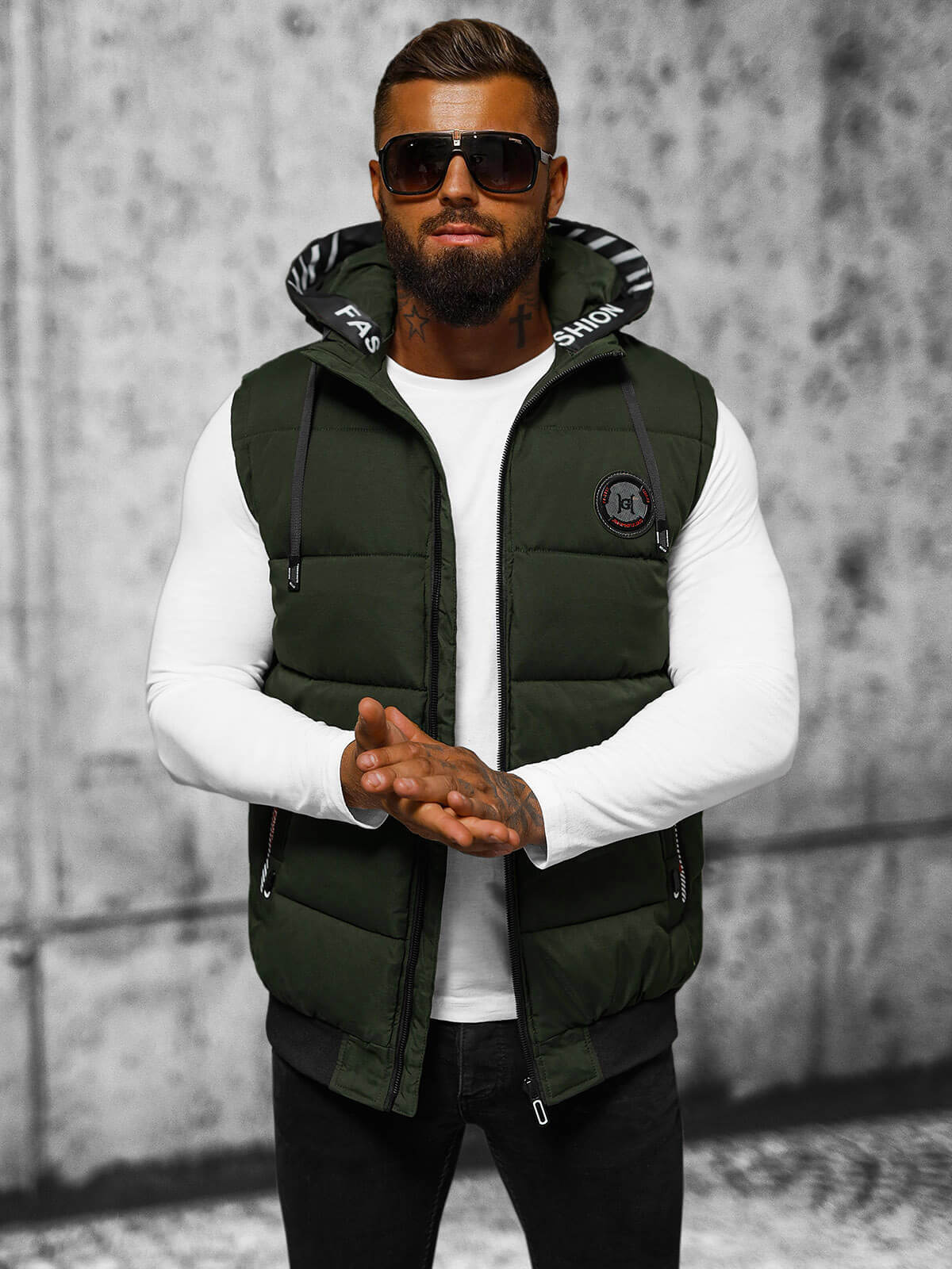 Model o wzroście 182 cm i wadze 87 kg prezentuje rozmiar XL. Kamizelka męska z kapturem zielona OZONEE JS/84M3028/136/X jest idealna dla mężczyzn, którzy cenią sobie modny wygląd i wysoką jakość wykonania. Doskonale sprawdzi się jako element codziennej garderoby, dodając stylu i charakteru każdej stylizacji.