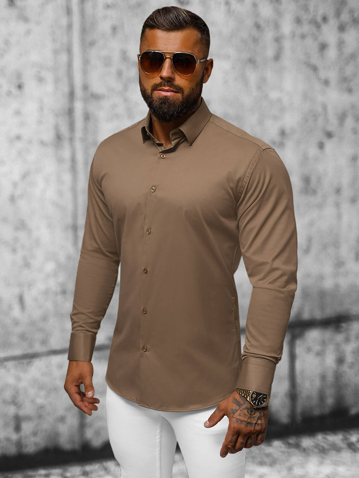 Koszula posiada klasyczny wzór, który pasuje do wielu różnych stylizacji. Jej brązowy kolor dodaje elegancji i sprawia, że można ją nosić zarówno na co dzień, jak i na specjalne okazje. Długi rękaw oraz kołnierz typu Kent nadają koszuli męskiego charakteru i sprawiają, że wygląda ona bardzo stylowo.