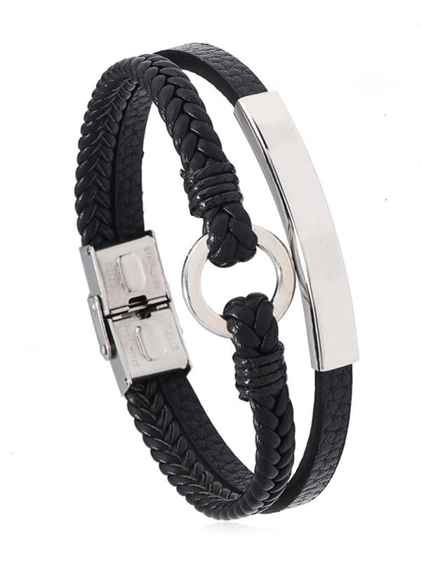 Komplet składa się z zestawu bransoletek wykonanych z wysokiej jakości skóry ekologicznej o plecionym wzorze oraz rzemyków w kolorze czarnym. Na przodzie znajduje się ozdobna metalowa wstawka. Obwód bransoletek jest regulowany sznurkami w zakresie od 16 do 24 centymetrów. Jedna z nich jest zapinana na napy i ma obwód 20 centymetrów.