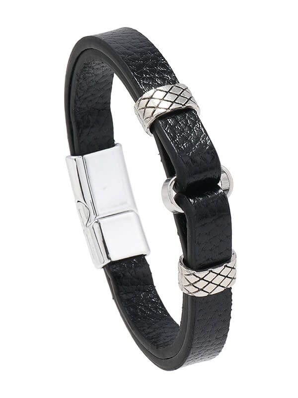 Bransoletka pochodzi z nowej kolekcji. Została wyprodukowana z trwałej, wytrzymałej, odpornej na uszkodzenia, elegancko prezentującej się skóry syntetycznej i posiada efektowne, metalowe wstawki w kolorach czarnym oraz srebrnym. Bransoletka jest zapinana na wygodny w użyciu, metalowy element. Jej obwód to 20 cm.