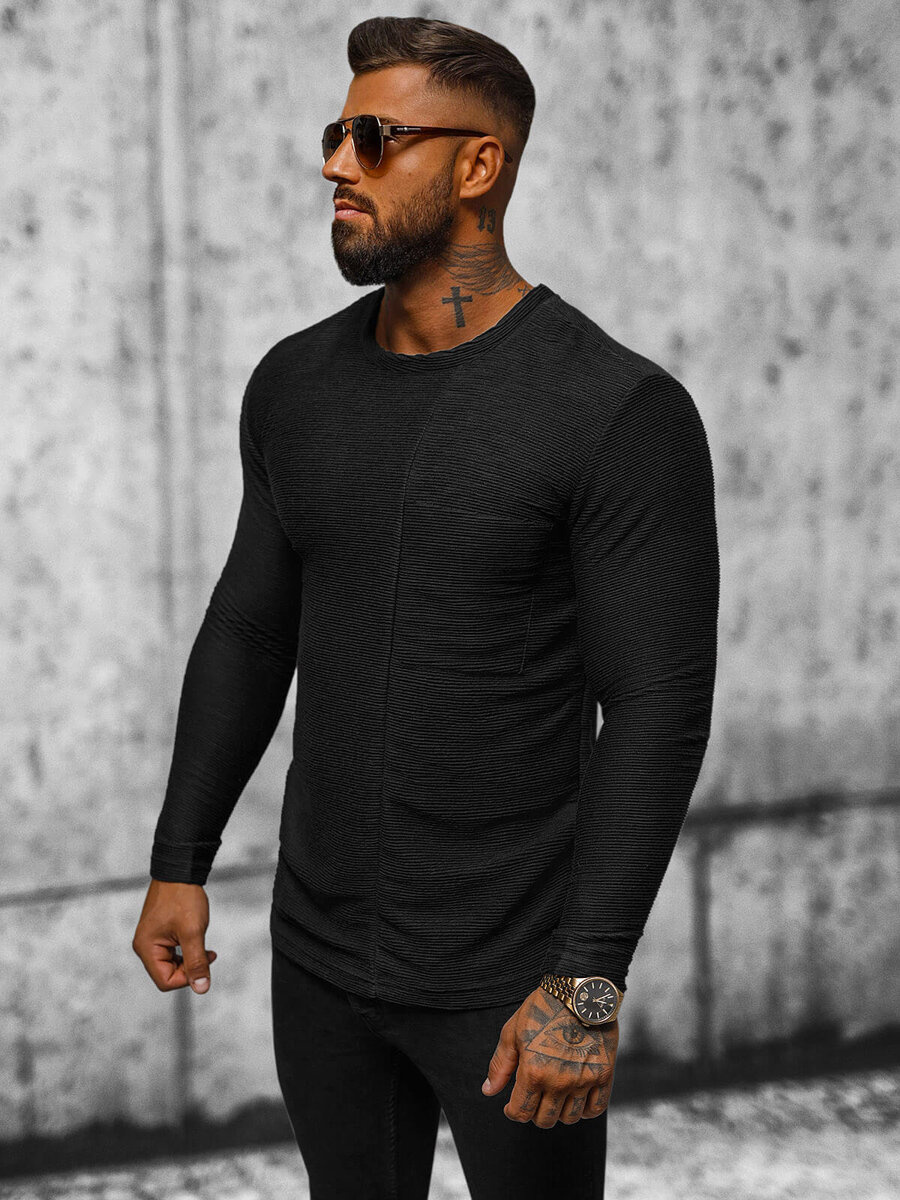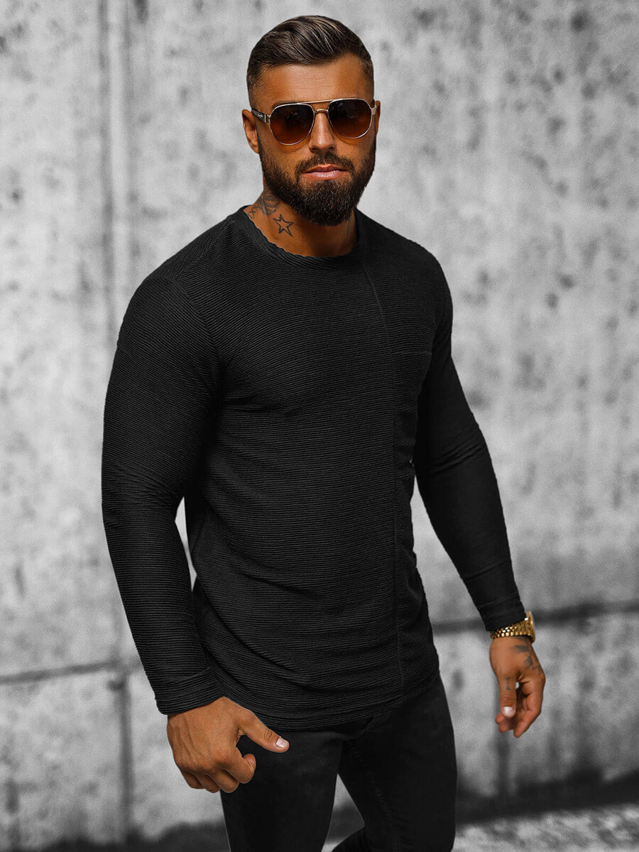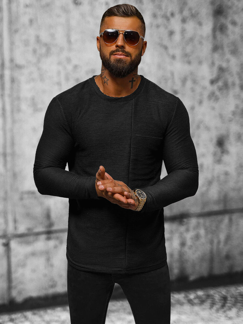 Bluza jest wkładana przez głowę. Posiada klasyczny, okrągły dekolt typu U-neck. Bluza ma dłuższy fason za pas, dzięki czemu dobrze sprawdzać będzie się u nieco wyższych mężczyzn. Pokrywający ją wzór w prążki nadaje jej oryginalnego wyglądu. Bluza została wykonana z wysokiej jakości poliestru z domieszką elastanu. Sprawia to, że ładnie dopasowuje się do sylwetki, nie rozciąga z czasem i nie gniecie.