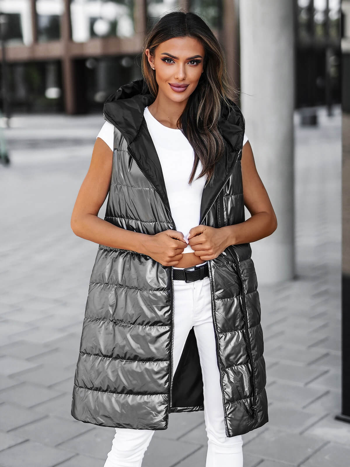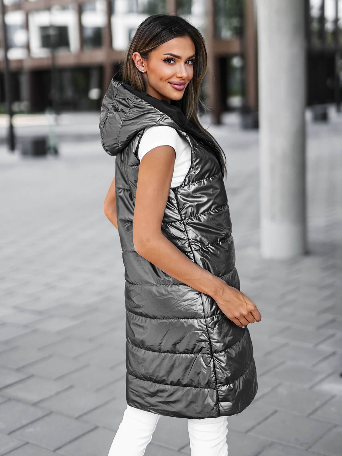 Kamizelka damska długa pikowana z kapturem grafitowa OZONEE JS/16M9117/105