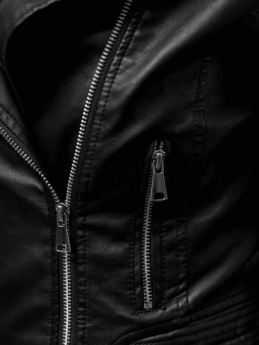 Kurtka pochodzi z naszej nowej kolekcji. Ma fason typu ramoneska, który charakteryzuje się długością do pasa, zapięciem na asymetryczny zamek oraz podwójnymi klapami. Po bokach kurtki znajdują się kieszenie na zamek błyskawiczny, do których można schować portfel, klucze czy telefon komórkowy. Ozdobne przeszycia na rękawach nadają jej oryginalnego wyglądu. Kurtka została wyprodukowana z poliuretanu, a jej podszewka — z poliestru.