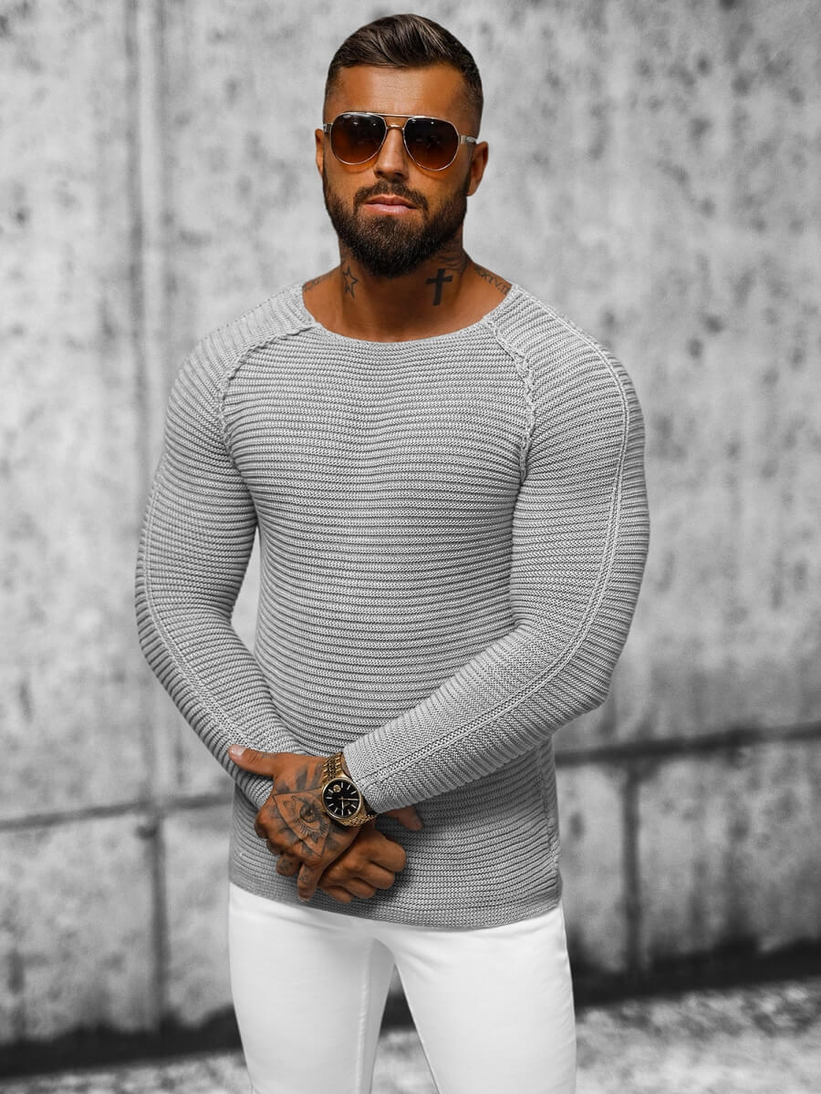 Sweter pokrywa wzór w prążki, dzięki czemu prezentuje się on bardzo efektownie. Posiada klasyczny, okrągły dekolt typu U-neck. Sweter został wyprodukowany z wysokiej jakości bawełny, akrylu oraz wiskozy. Sprawia to, że jest wygodny w noszeniu, przyjemny w dotyku, nie rozciąga się, nie gniecie i ładnie dopasowuje się do sylwetki.