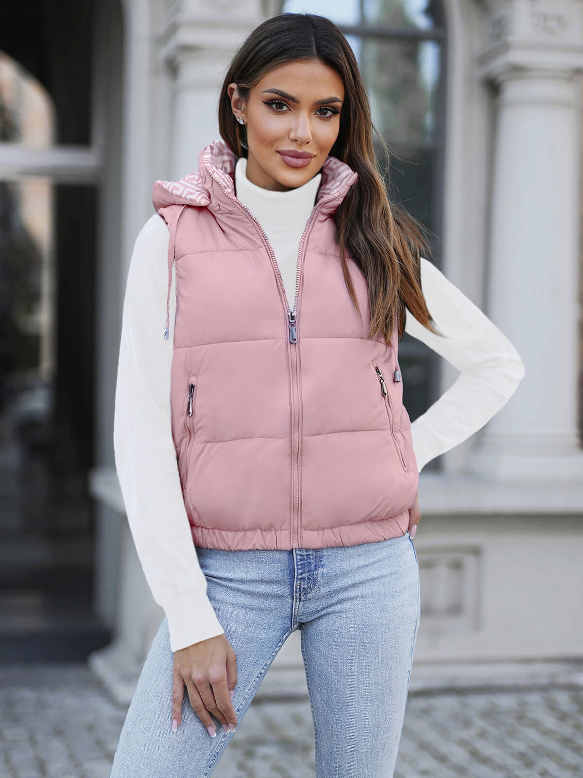 Kamizelka damska z najnowszej kolekcji, zapinana na zamek, posiada odpinany kaptur, modne pikowania, wysoki kołnierz typu komini oraz kieszenie po bokach na zamek. Wykonana z wysokiej jakości materiału - 100% poliestru. Modelka o wzroście 174 cm prezentuje rozmiar M.