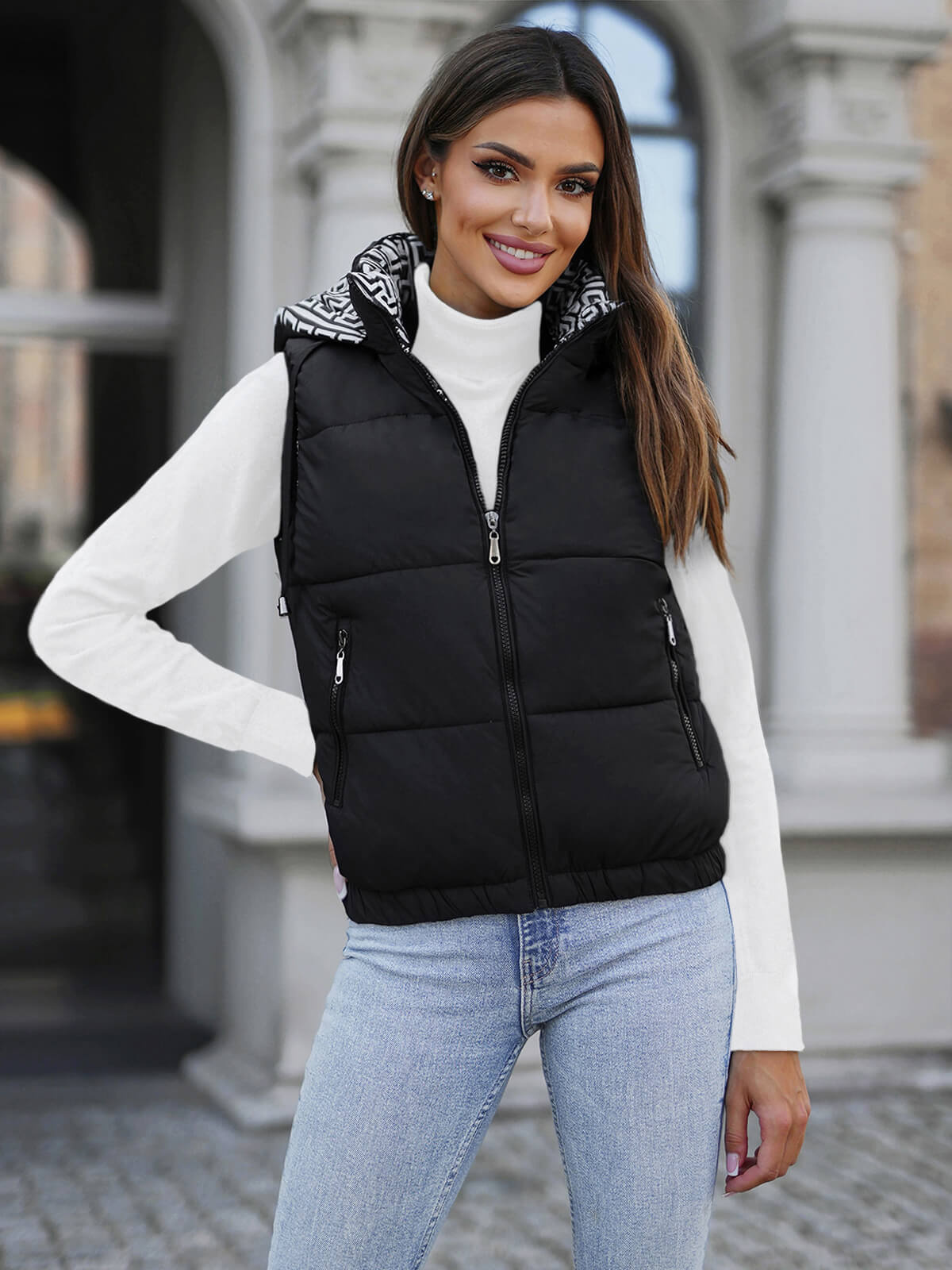 Kamizelka damska z najnowszej kolekcji, zapinana na zamek, posiada odpinany kaptur, modne pikowania, wysoki kołnierz typu komini oraz kieszenie po bokach na zamek. Wykonana z wysokiej jakości materiału - 100% poliestru. Modelka o wzroście 174 cm prezentuje rozmiar M.