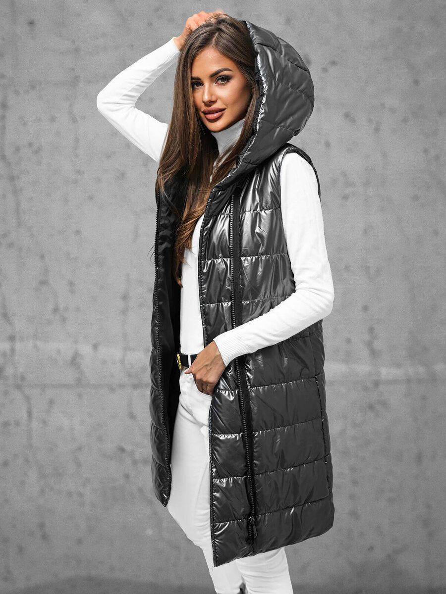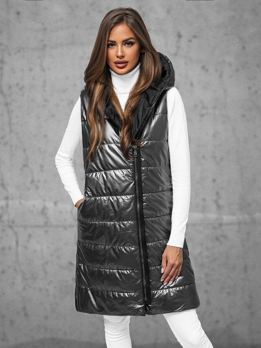 Kamizelka damska długa pikowana z kapturem grafitowa OZONEE JS/16M9117/105
