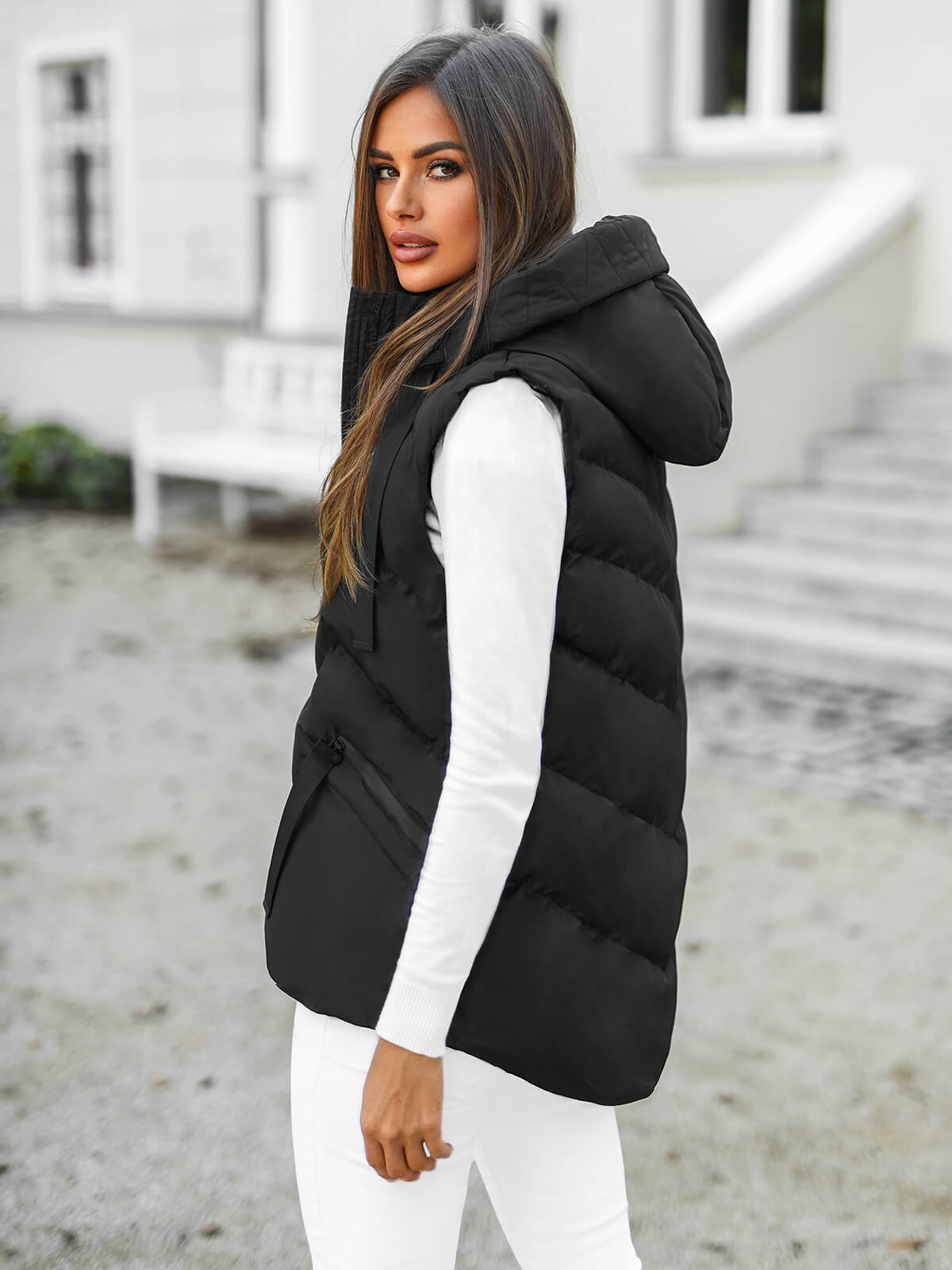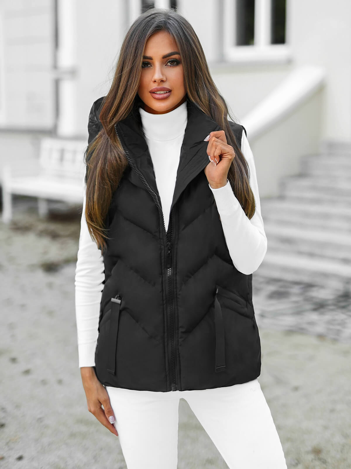 Modelka na zdjęciu ma wzrost 174 cm i nosi rozmiar M. Ta kamizelka damska jest idealna dla wszystkich kobiet, które cenią sobie modny wygląd, wygodę i funkcjonalność w jednym produkcie.