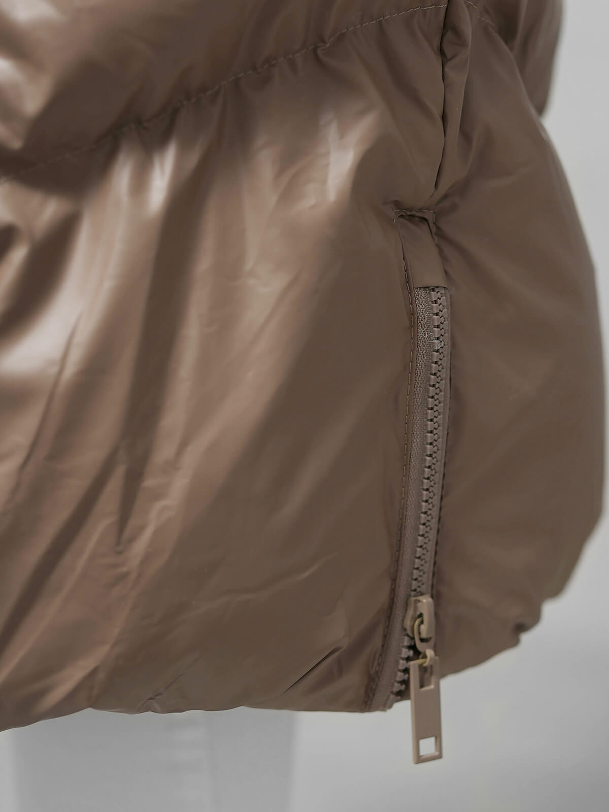 Długa damska kamizelka z najnowszej kolekcji prezentuje się z elegancją i nowoczesnym stylem. Wykonana z materiału imitującego skórę, jest nie tylko wyrazista w swoim wyglądzie, ale również praktyczna. Posiada kaptur, który doda Ci ochrony w chłodniejsze dni, oraz modne pikowania, które nadają jej wyjątkowego charakteru. Kieszenie po bokach są funkcjonalnym i stylowym dodatkiem. Materiał z 100% poliuretanu oraz podszewka z 100% poliestru zapewniają komfort noszenia. Modelka (178 cm) ma na sobie rozmiar M.