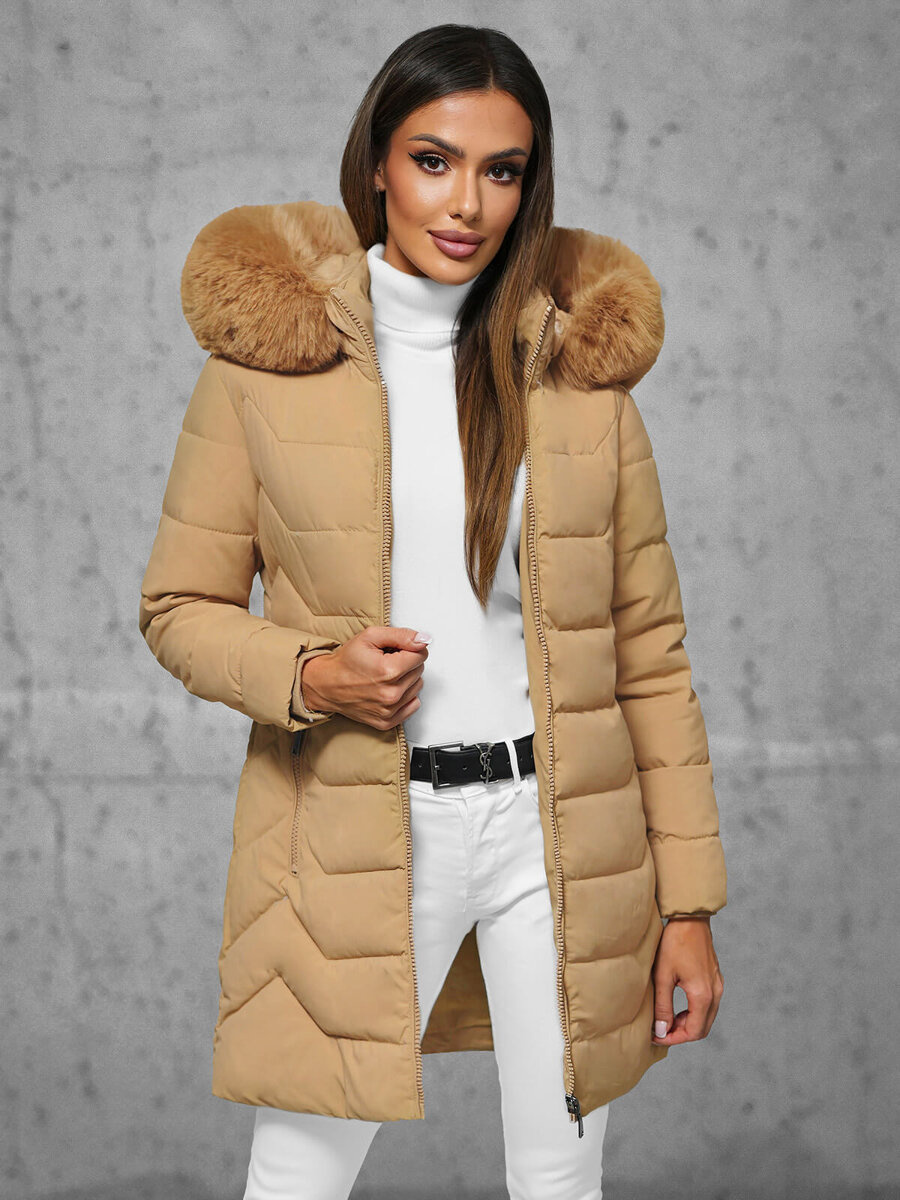 Kurtka zimowa damska długa z futerkiem beżowa OZONEE JS/16M9121/62 - elegancja spotyka funkcjonalność